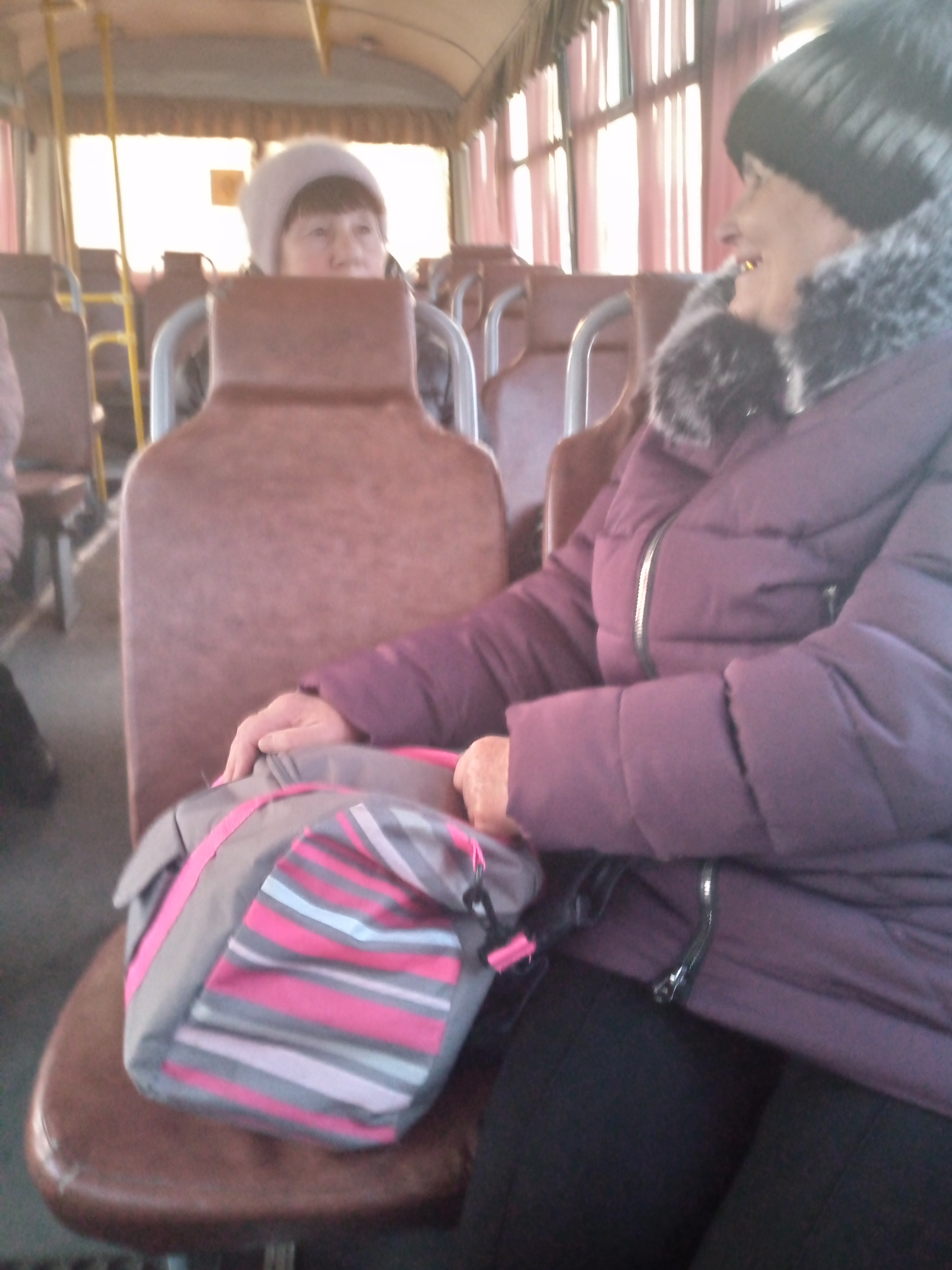 К остановке подъезжает автобус. Собравшиеся заходят внутрь. Две женщины обнимаются: давно не виделись.