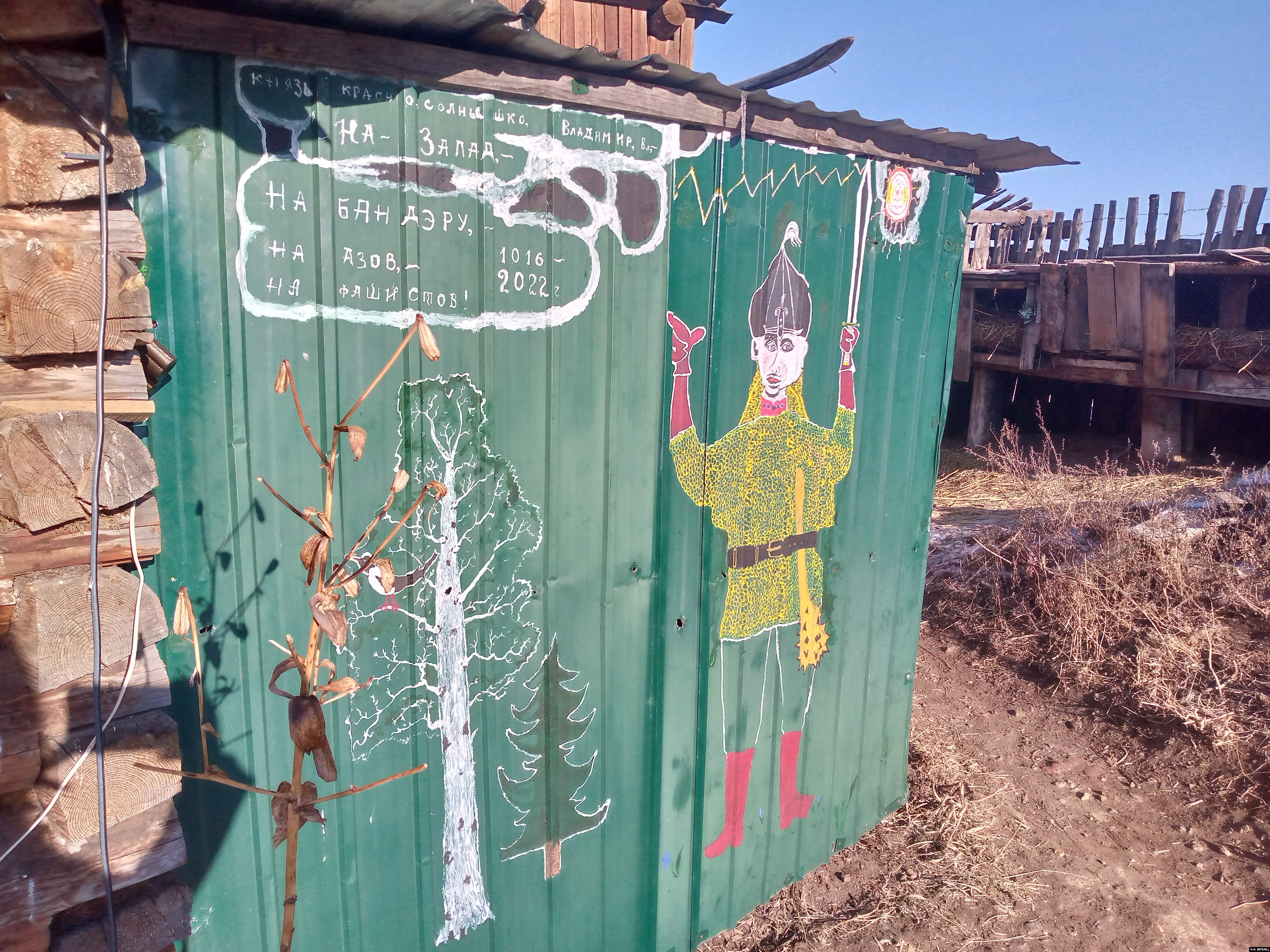 Во дворе находится гараж, на котором нарисован портрет Владимира Путина, рядом надписи "На Бандеру", "На Азов", "На фашистов".