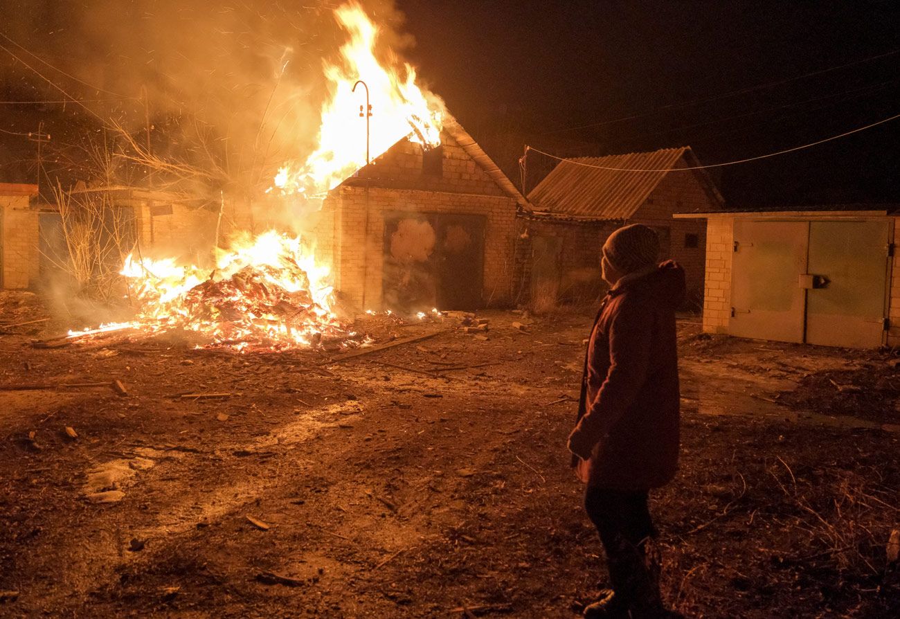 На фото: сгоревшая российская РСЗО «Ураган» и поврежденные дома в поселке Сосновое Краматорского района Донецкой области, 1 марта.