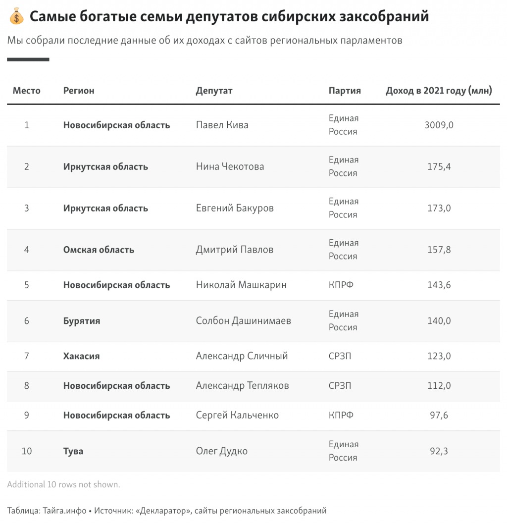 Топ-10 рейтинга с большим отрывом возглавляют новосибирский единоросс Павел Кива и его жена, заработавшие 3 млрд рублей. Кива утверждает, что основную часть средств получил как индивидуальный предприниматель.
