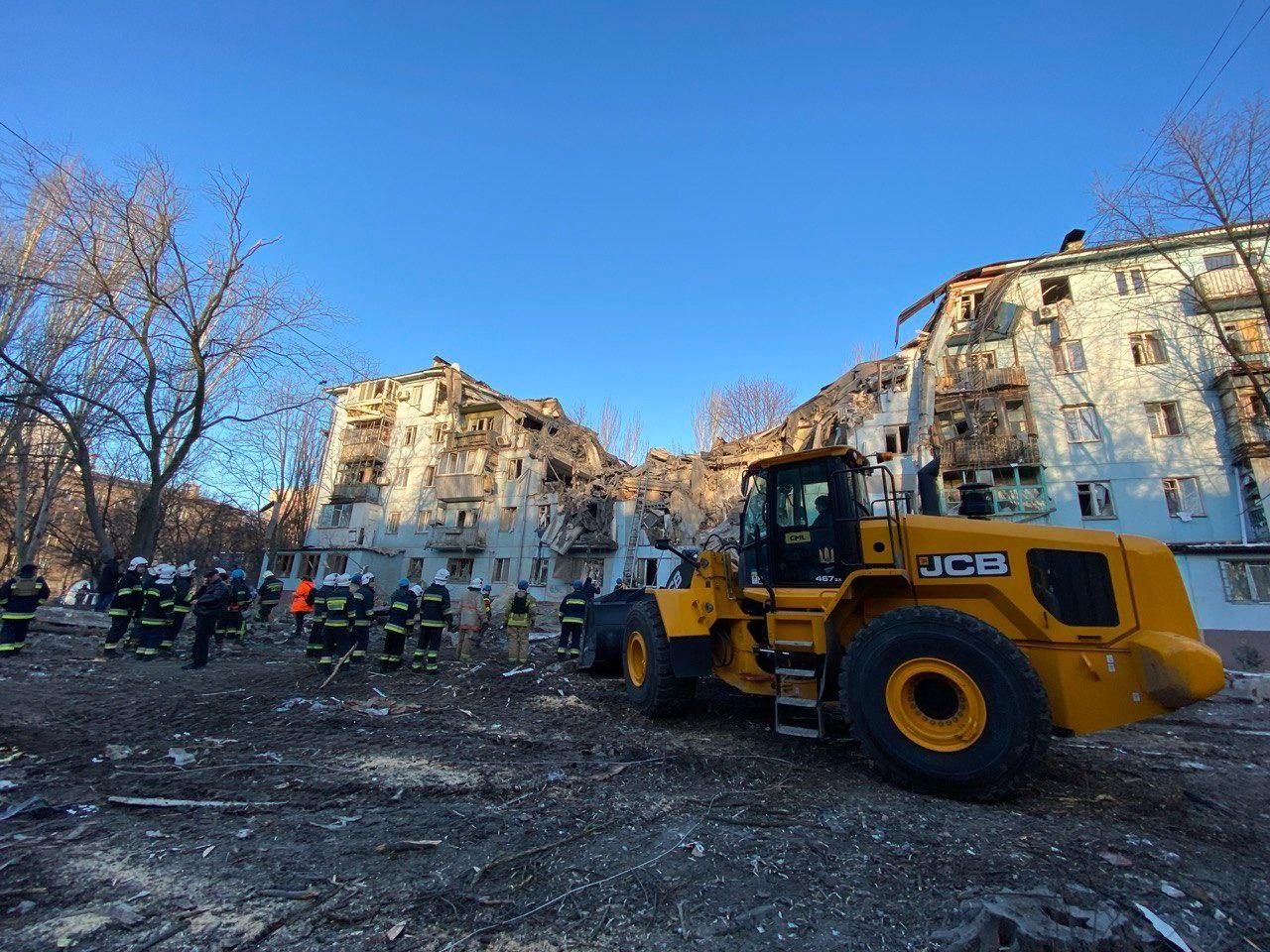 Ракета попала в жилой пятиэтажный дом, и произошло обрушение. Как минимум два человека погибли. Спасатели извлекли их тела из-под завалов.