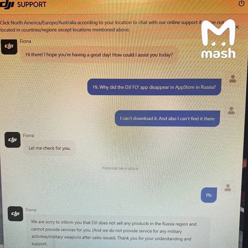 На все жалобы DJI отвечает: "просим прощения, но мы не предоставляем свои услуги россиянам, а также не предоставляем услуги по какой-либо военной деятельности, поэтому спасибо за понимание".