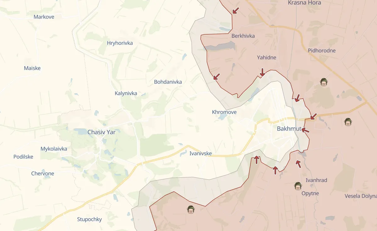 После взятия в январе Соледара, расположенного в 10 километрах к северу от Бахмута, российские войска продолжили наступление на юг и на запад, захватив Благодатное, Красную Гору, Берховку и Ягодное.