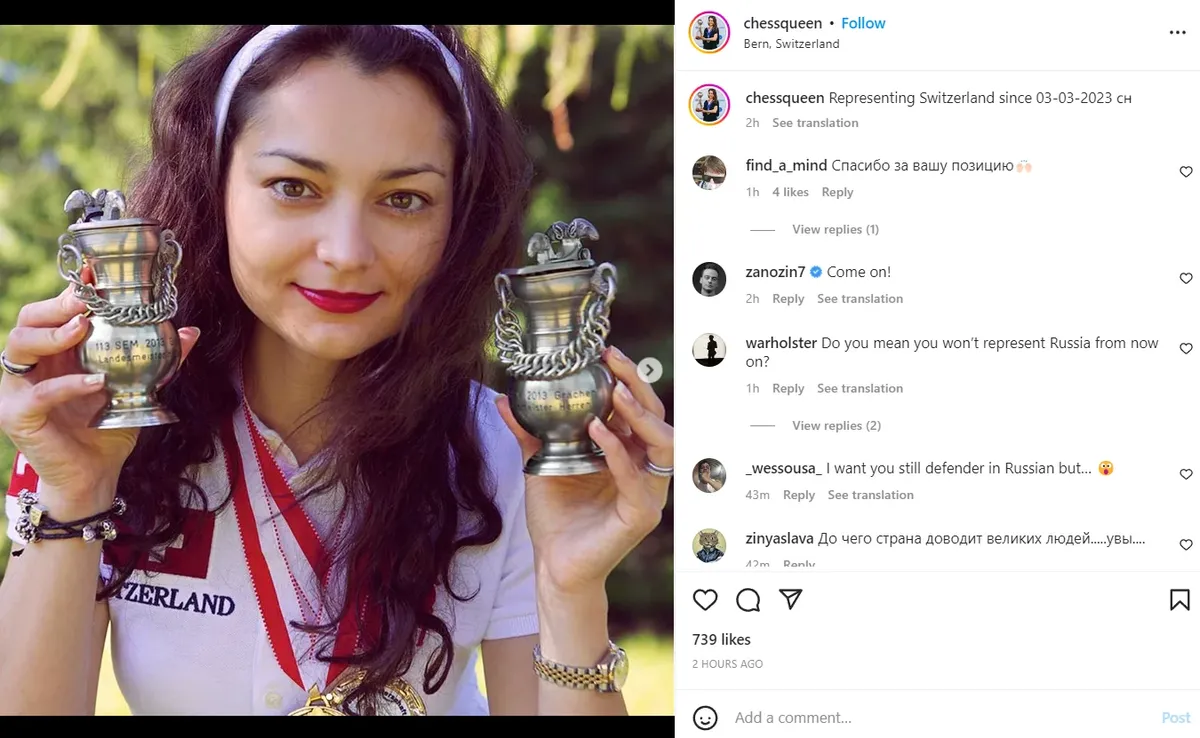 «Представляю Швейцарию с 3 марта 2023 года», — написала Костенюк. Она также опубликовала скриншот с сайта Международной шахматной федерации (FIDE), на котором теперь отмечена швейцарским флагом.
