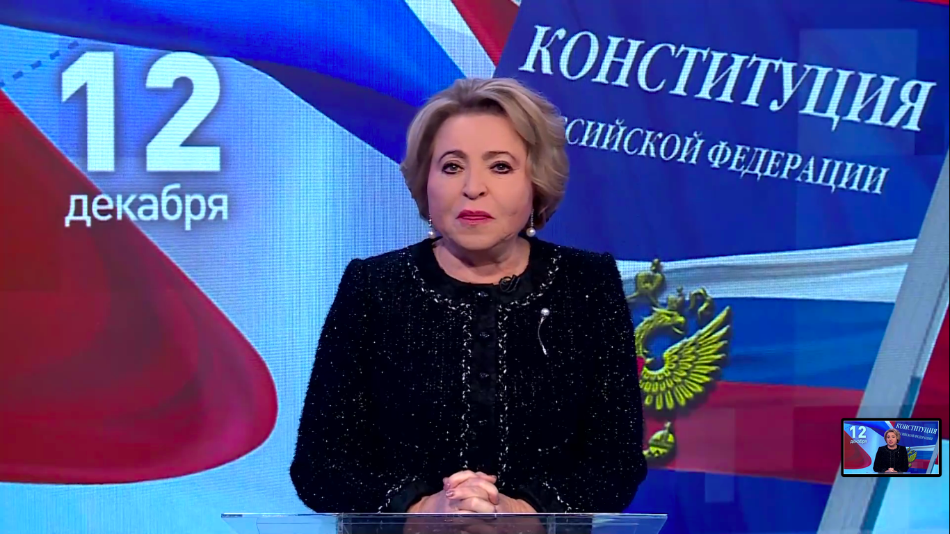 Валентина Матвиенко поздравила школьников с Днем Конституции и попросила их «проникнуться духом» документа на фоне изображения с надписями «Преемственность поколений» и «Историческая память». Она также заявила, что Россия — социальное правовое государство и самая большая страна в мире.