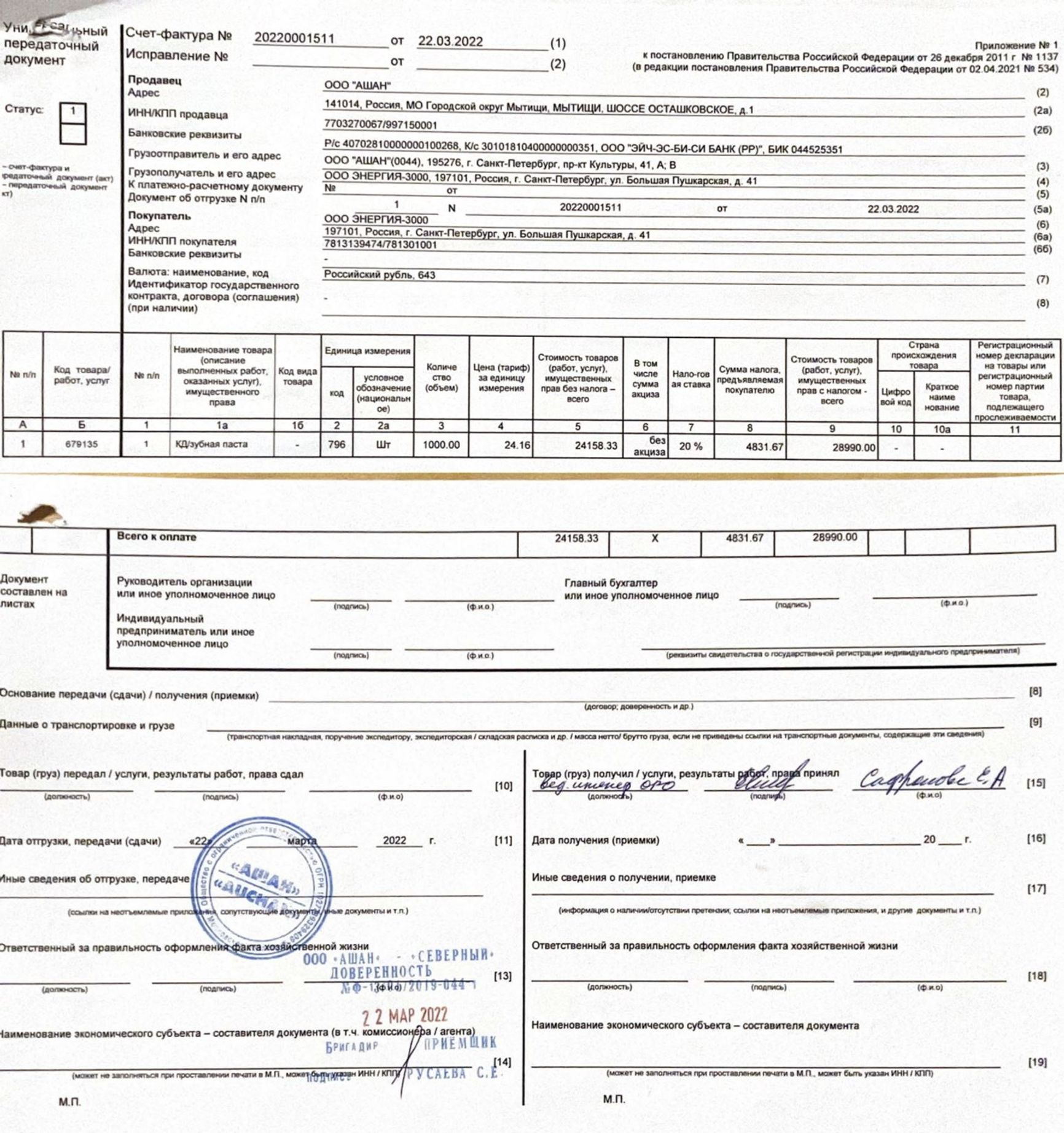 According to these documents, the toothpaste was to be picked up by the company Energy-3000 (TIN 7813139474). At 3:28 p.m., Seltzer instructed Rusayeva, an employee of the Auchan Severny hypermarket’s warehouse, to print and prepare the UTDs.