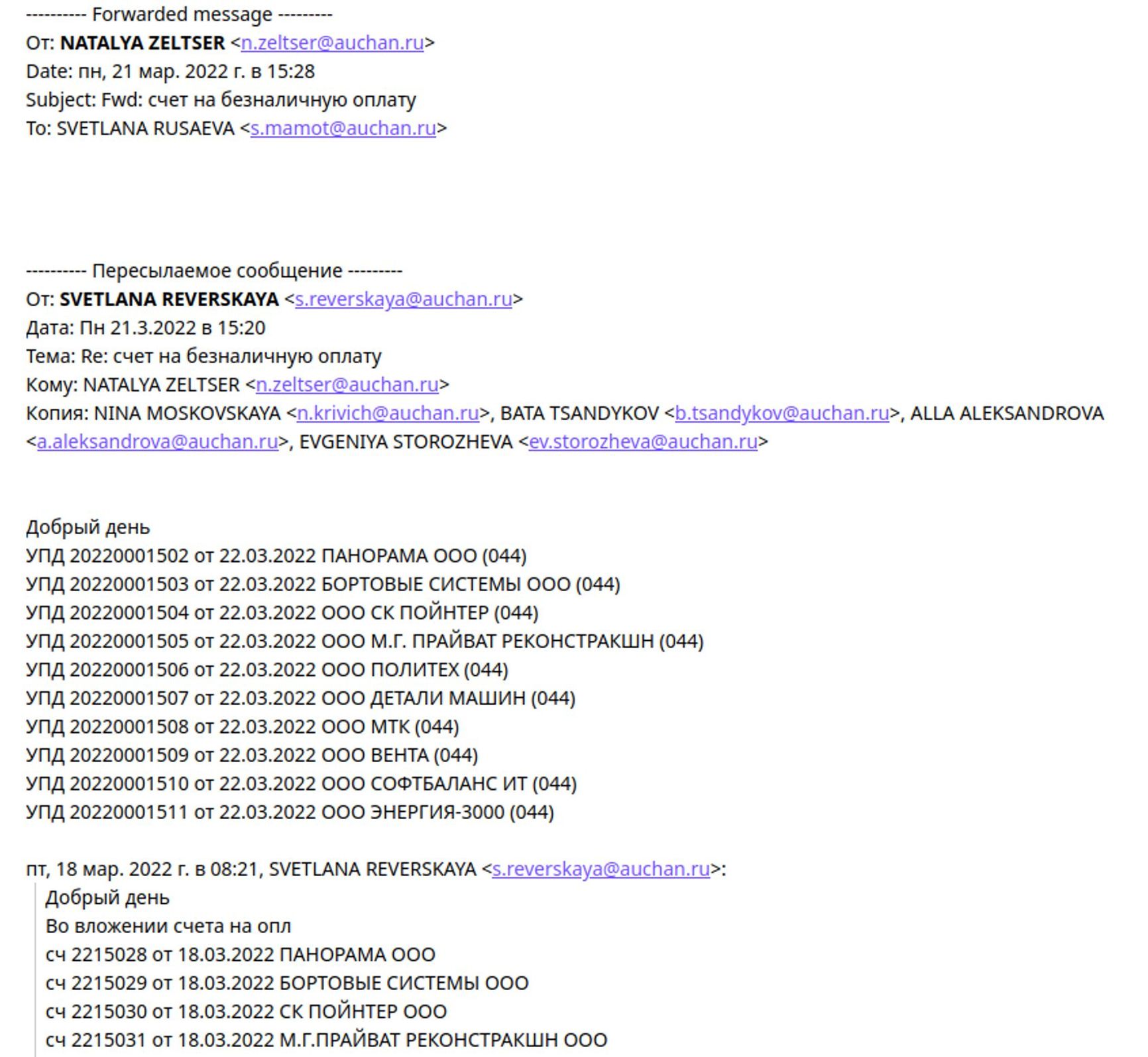 At 2:50 p.m. on March 17, 2022, Natalia Seltzer, Auchan's directorate controller, requested the corporate accounting department of Auchan's Central Office in Moscow to generate invoices for 10 legal entities. The invoices were confirmed by the accountant at Auchan’s Central Office on March 18. All ten selected companies fulfill orders for state-owned companies or municipal institutions.
