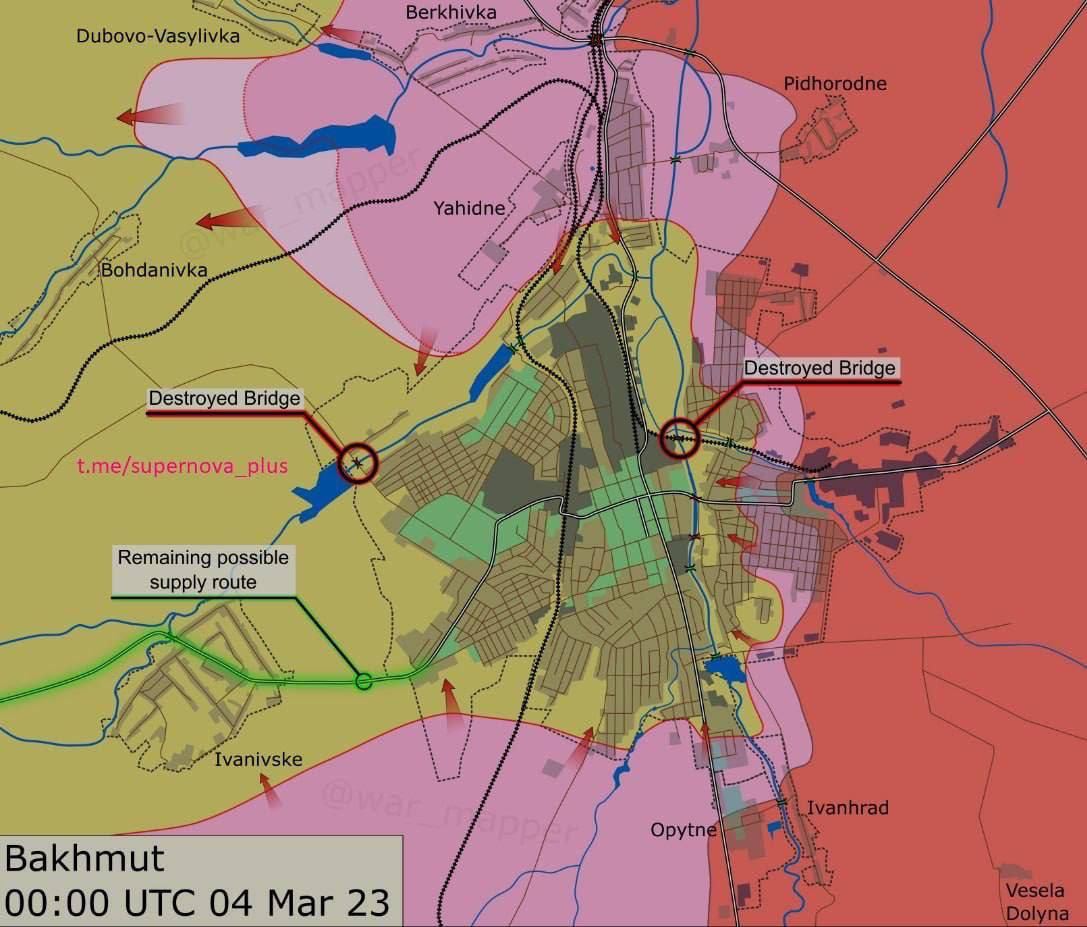 В пятницу в интернете появились кадры, которые говорят об уничтожении украинскими военными двух важных мостов в Бахмуте — один через реку Бахмутовка на северо-востоке города и другой на трассе к поселку Хромово к западу от Бахмута. Превентивное уничтожение мостов может свидетельствовать о том, что ВСУ рассчитывают помешать продвижению российских войск в восточной части Бахмута и ограничить потенциальные пути их наступления, отмечают аналитики ISW.