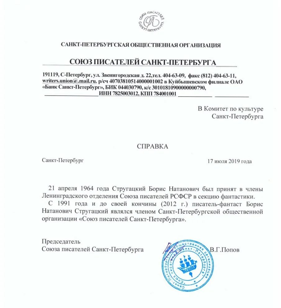 Когда я приехал за этой справкой в Союз писателей Санкт-Петербурга, там началось безудержное веселье. «Вот именно я буду тем человеком, который выпишет справку, что Борис Натанович был писателем!» — хохотал зампред Союза и директор Фонда братьев Стругацких Сергей Арно. Что же, копия этой справки и поныне висит у меня на стене в рабочем кабинете в Законодательном собрании…