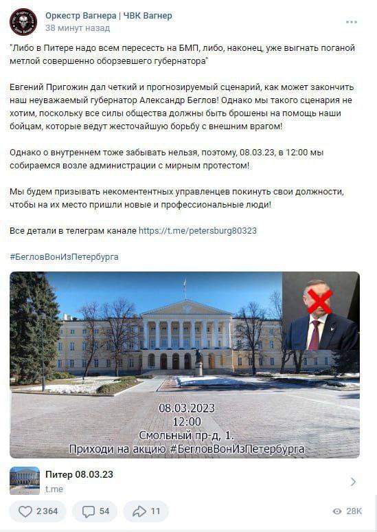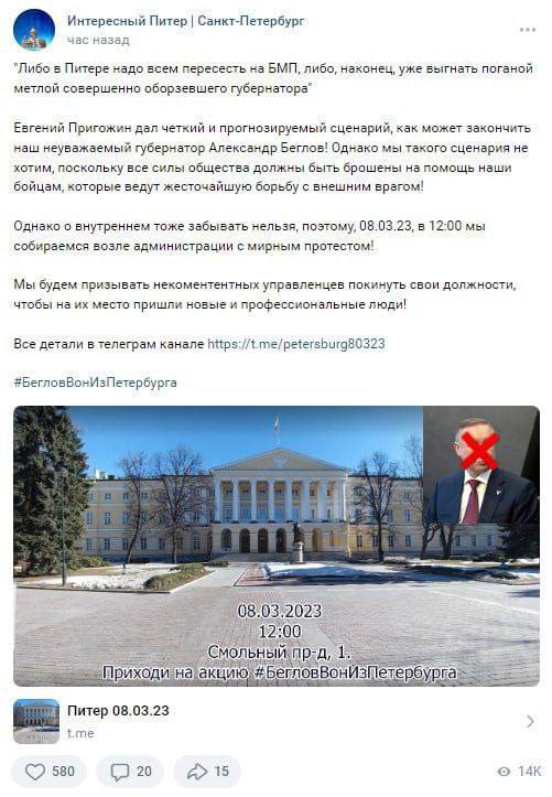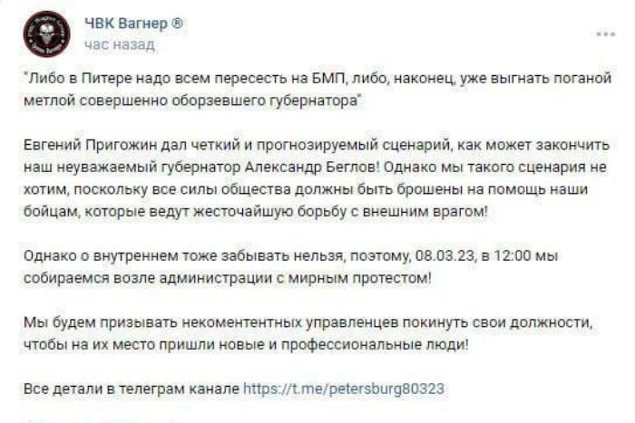 Телеграм-каналы и пользователи твиттера обнаружили, что в пабликах, возможно связанных с главой ЧВК «Вагнер» Евгением Пригожиным, появились призывы выйти 8 марта на митинг против губернатора Петербурга Александра Беглова. Это фейк, убедилась «Бумага».