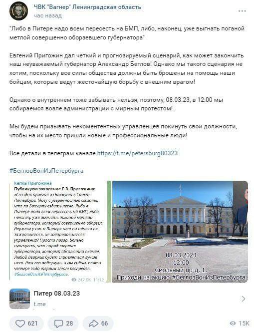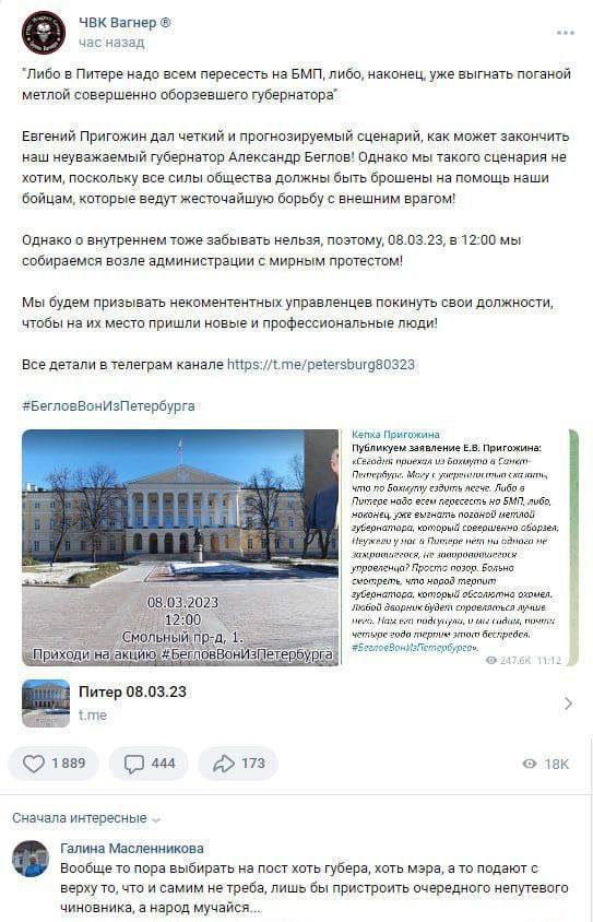 - 5 марта пресс-служба Евгения Пригожина опубликовала заявление основателя ЧВК «Вагнер» о захвате Бахмута в Украине. «Могу с уверенностью сказать, что по Бахмуту ездить легче. Либо в Питере надо всем пересесть на БМП, либо наконец уже выгнать поганой метлой губернатора, который совершенно оборзел», — добавил Пригожин. Сообщение сопровождалось хештегом «#БегловВонИзПетербурга».