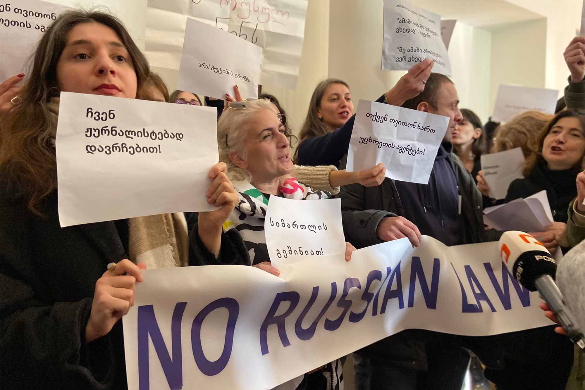 Скандируя "Нет российскому закону", журналисты и активисты протестовали перед зданием парламента Грузии 2 марта, когда комитеты обсуждали два широко критикуемых законопроекта о так называемых иностранных агентах. Была задействована полиция, и в результате драки несколько протестующих, в том числе журналисты, были арестованы, но позже той же ночью отпущены. (6 марта акции протеста продолжались, депутаты даже подрались в зале заседаний, — Дрон).