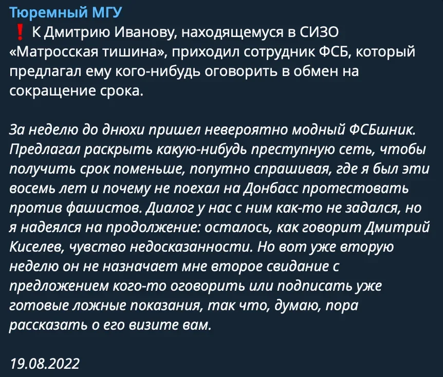 Тимирязевский суд Москвы приговорил к 8,5 годам в колонии общего режима гражданского активиста и автора телеграм-канала «Протестный МГУ» Дмитрия Иванова за распространение «фейков» о российских военных. Все обвинение строится на лингвистической экспертизе ФСБ и на допросах свидетелей, которые явно испытывали к подсудимому неприязнь. По мнению защиты, доказательств вины Иванова в суде озвучено не было, а ложность распространенной в телеграм-канале информации так и не была доказана.