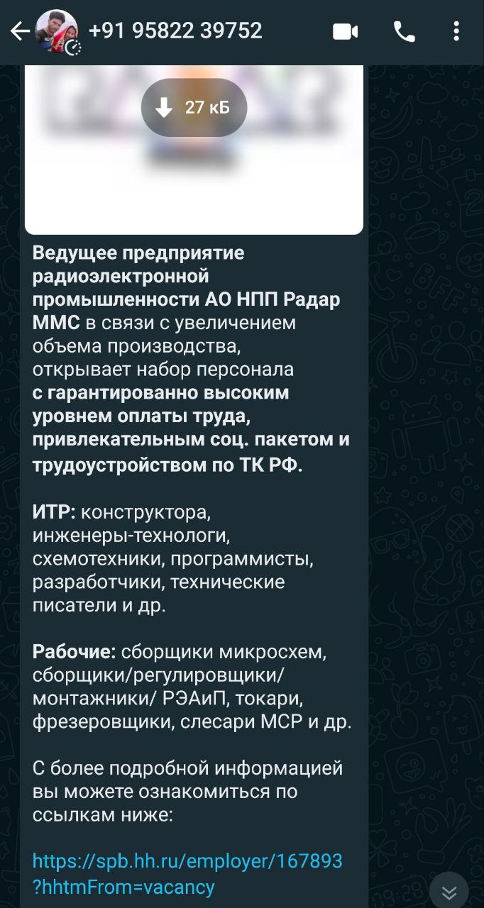 С начала года «Радар ММС» тоже ищет новых сотрудников. Двое читателей «Бумаги», работающие в IT-компаниях, рассказали, что им в мессенджере прислали ссылки на вакансии компании с сайта HeadHunter. По словам одного из собеседников, сообщение пришло с таймером автоматического удаления.