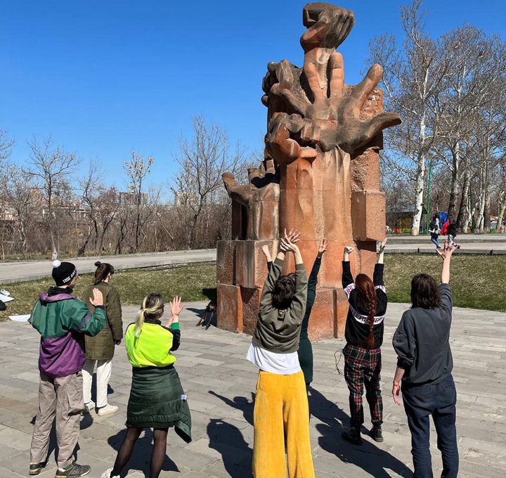 Художница не сразу перебралась в Грузию из России. Несколько недель она жила в Ереване, где устроила уличную акцию у памятника жертвам Великой Отечественной.
