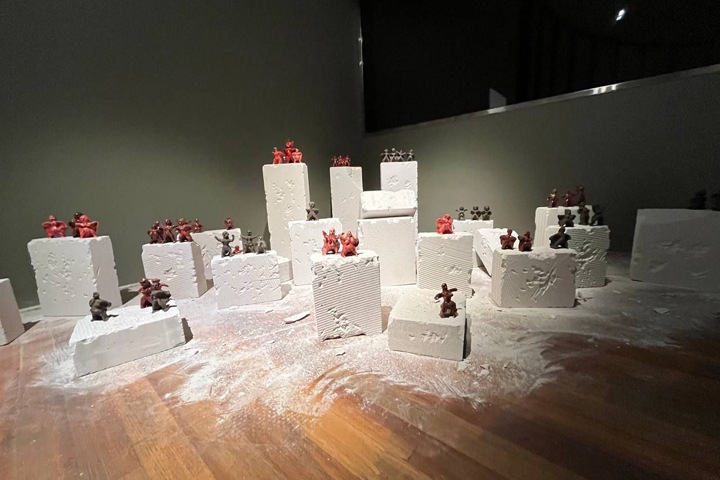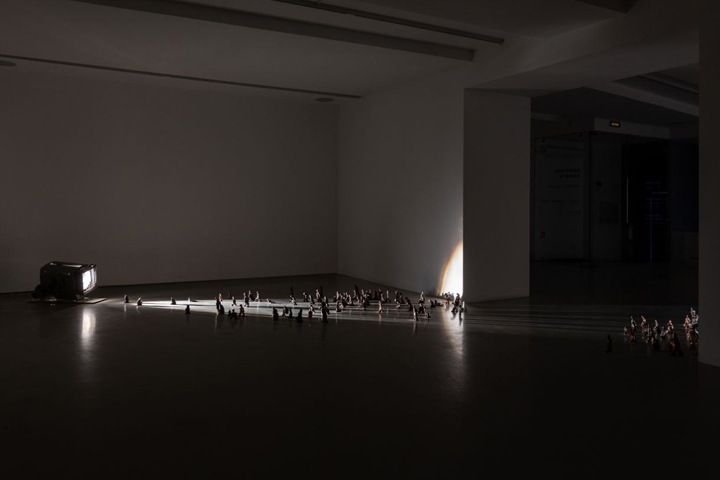 Фильм, снятый несколько лет назад, недавно показали в петербургской галерее Anna Nova, где продолжается выставка Маяны «Памятник памяти», отсылающая и к сегодняшним событиям: толпа маленьких человечков бредет то ли в эмиграцию, то ли на передовую.