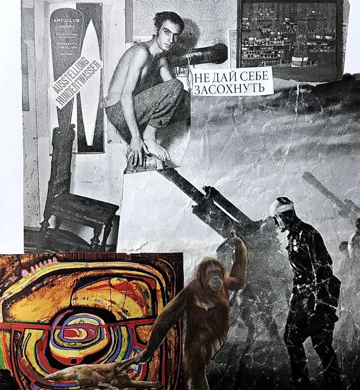 «Коллаж „Не дай себе засохнуть“. На уроке было задание собрать коллаж. Желтенькая абстракция — это то, что случается с человеком до его рождения или после его смерти. Мир, в котором нет ничего, и одновременно есть всё. Из этого большого взрыва, из этого ничто появилась первая клетка, которая позднее эволюционировала в земноводное, в млекопитающее. Обезьяна со своим детенышем выходит и ведет поколение будущих людей в светлый, дивный, новый мир. А там война происходит черно-белая. Но сверху за этим следит один очень большой художник и говорит: „Не дай себе засохнуть“. Не засыхай. Несмотря ни на что, просто продолжай делать свое дело. Делай добро и любовь», — рассказала девушка.