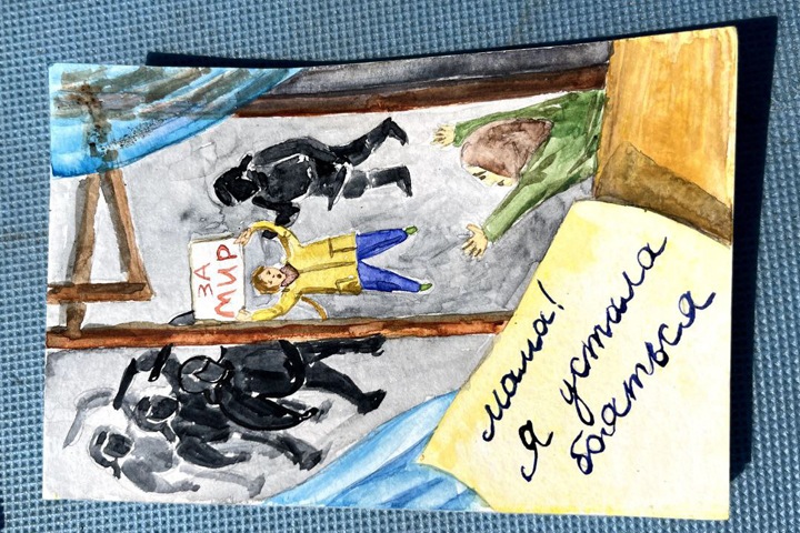 Еще одна сибирская художница, работающая с повесткой, попросила не называть ее имя. Девушка учится в художественном колледже. Она уже участвовала в нескольких коллективных выставках, но недовольна своими работами, а после 24 февраля по-новому взглянула на мир.