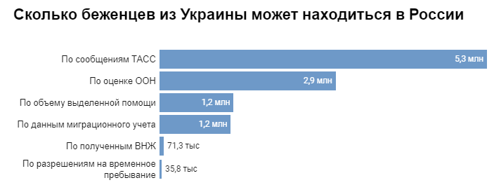 О количестве прибывших в РФ украинских беженцев регулярно сообщает государственное агенство ТАСС. В своих публикациях оно ссылается на неназванный источник в силовых структурах. При этом в фонде "Гражданское содействие" заявляют: в России в принципе отсутствует нормальная статистика по беженцам.