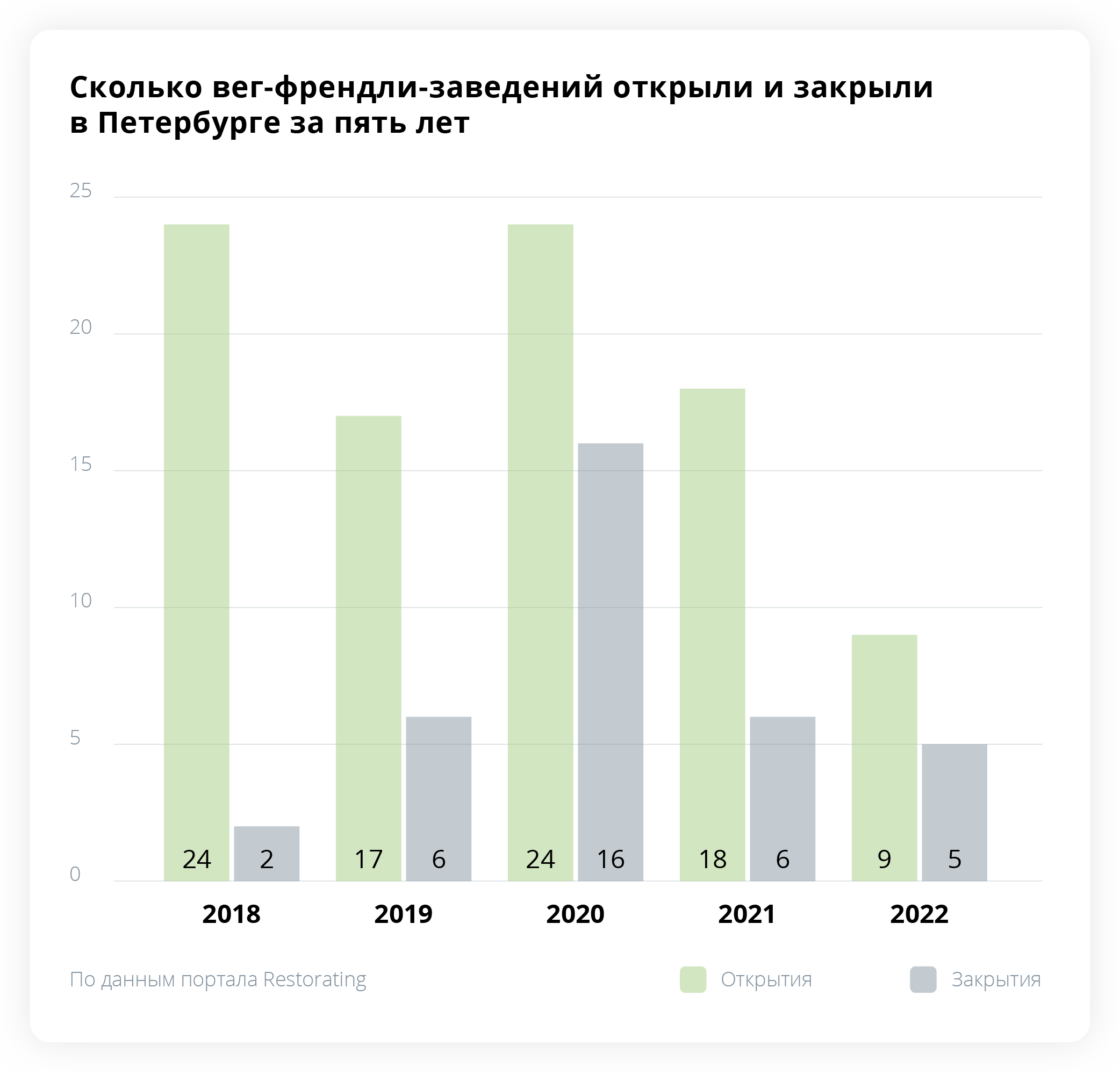 «Бумага» запросила статистику по открытиям и закрытиям заведений растительной кухни у портала Restorating. Из этих цифр следует, что пик закрытия веганских и вегетарианских заведений за последние пять лет пришелся на 2020 год — например, именно тогда прекратила работу сеть вегетарианских кафе «Укроп». Позднее проект перезапустили в формате доставки, в этом качестве он работает и сейчас.