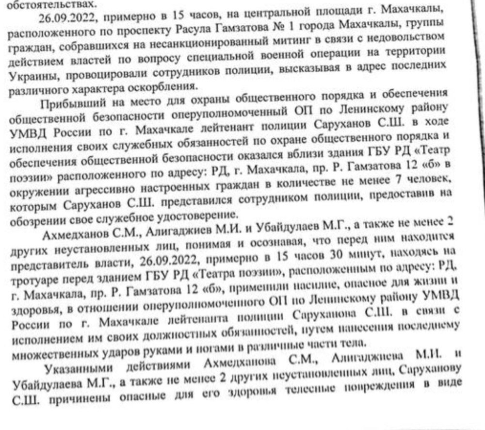 По версии следствия, четверо дагестанцев причастны к избиению лейтенанта полиции С. Саруханова. Силовик присутствовал на акции против мобилизации в Махачкале 26 сентября, он был одет в штатское.