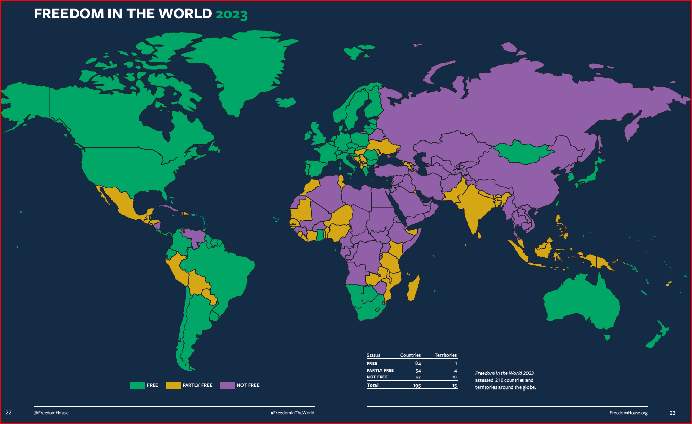 17-й год подряд наблюдается снижение глобального уровня свободы и соблюдения прав человека, отмечается в докладе. В то время как Россия ведет полномасштабную войну против Украины и на фоне глобальных экономических проблем авторы доклада регистрируют деградацию гражданских прав и свобод, среди которых свобода слова.