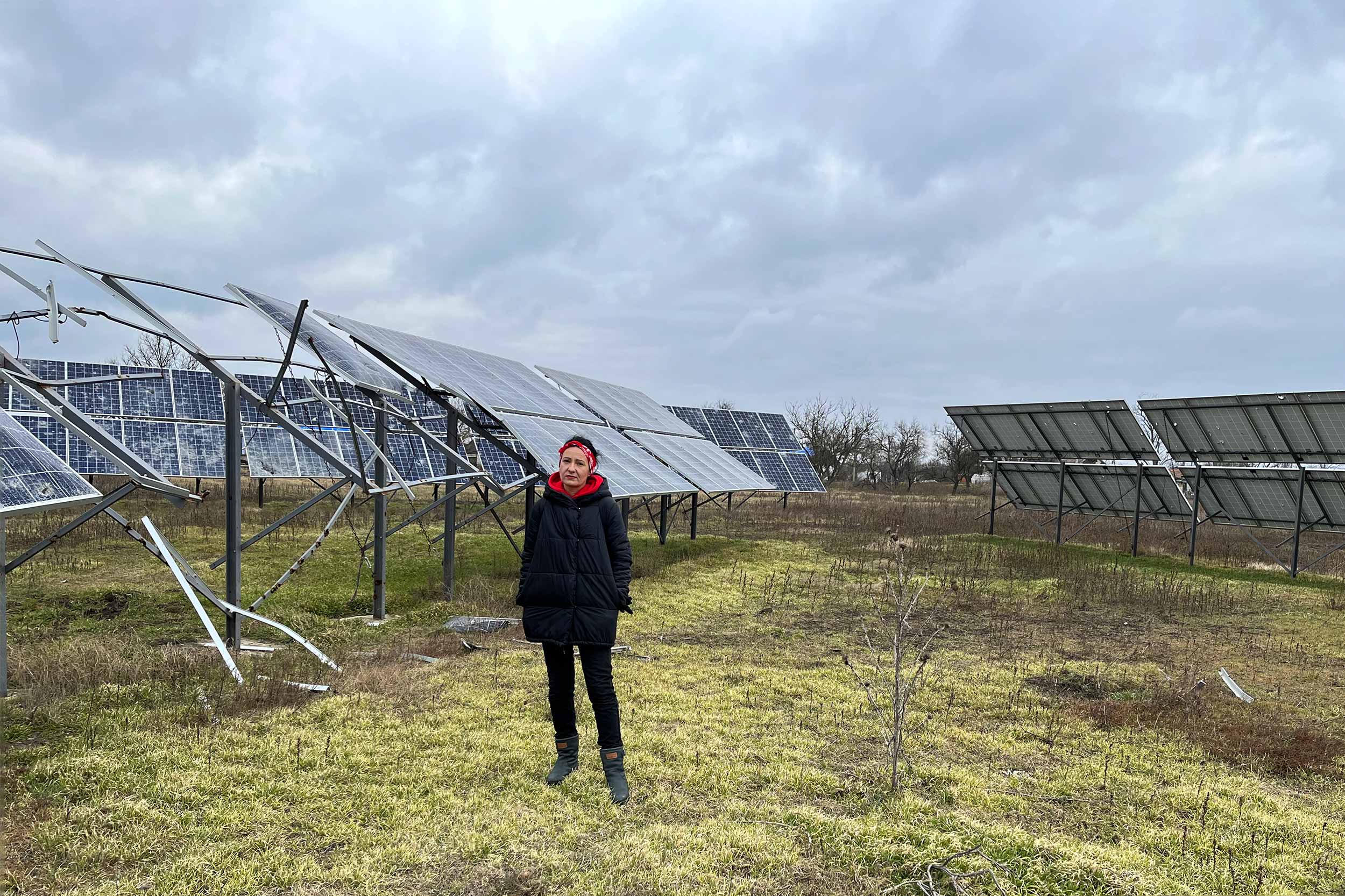 Людмила Яловенко на фоне разрушенных россиянами солнечных панелей. Это были все сбережения ее семьи. Фото IWPR