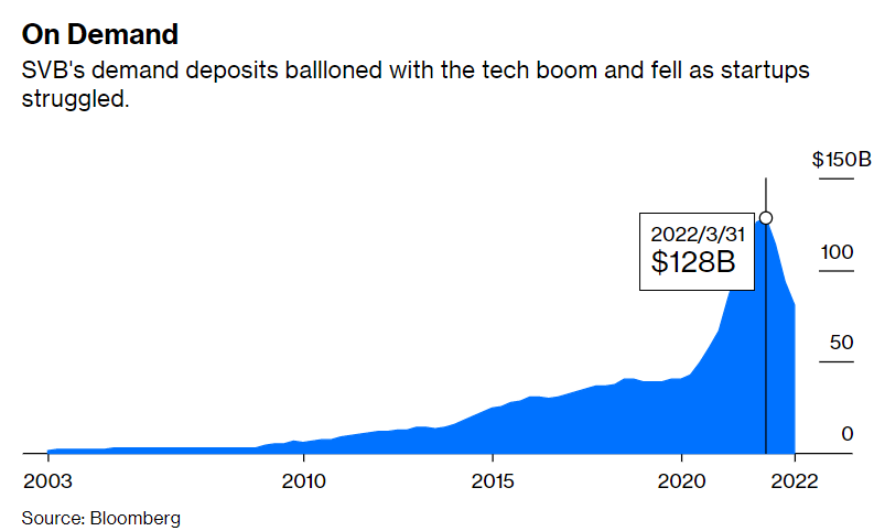 Bloomberg: К марту 2022 года у SVB скопилось почти $130 млрд депозитов до востребования — а к концу года $50 млрд из них самые умные клиенты предпочли забрать