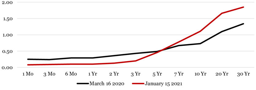 Доходность американских гособлигаций в процентах (вертикальная шкала) в зависимости от их срока погашения (горизонтальная шкала) в 2020–2021 годах (источник)