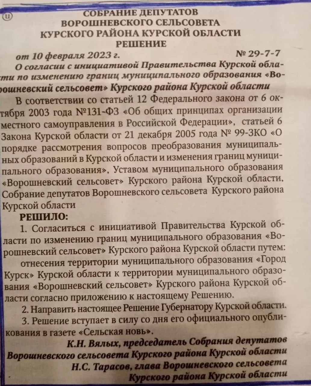 Также Старовойт не упомянул, что с начала месяца правительство Курской области делало все, чтобы такая возможность появилась. 8 февраля первый заместитель губернатора Алексей Дедов подписал распоряжение, призывающее выступить с инициативой по изменению границ города. Курское городское собрание инициативу поддержало и в пояснительной записке к решению признало: в городе нельзя прокладывать магистральный газопровод — поэтому часть микрорайона Волокно и следует передать в состав Ворошневского сельсовета.