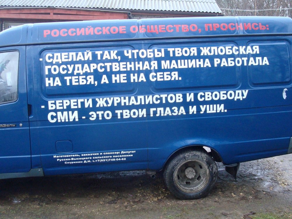 Кроме магазина, Дмитрий Скурихин обклеивал лозунгами свой автомобиль. Он писал: «Не признаю Путина президентом. Скажи Путину: „Нет“», «Гражданин Путин, не доводите Россию до Сирии — не выбирайтесь больше в президенты» и «Российское общество, проснись. Сделай так, чтобы твоя жлобская государственная машина работала на тебя, а не на себя».