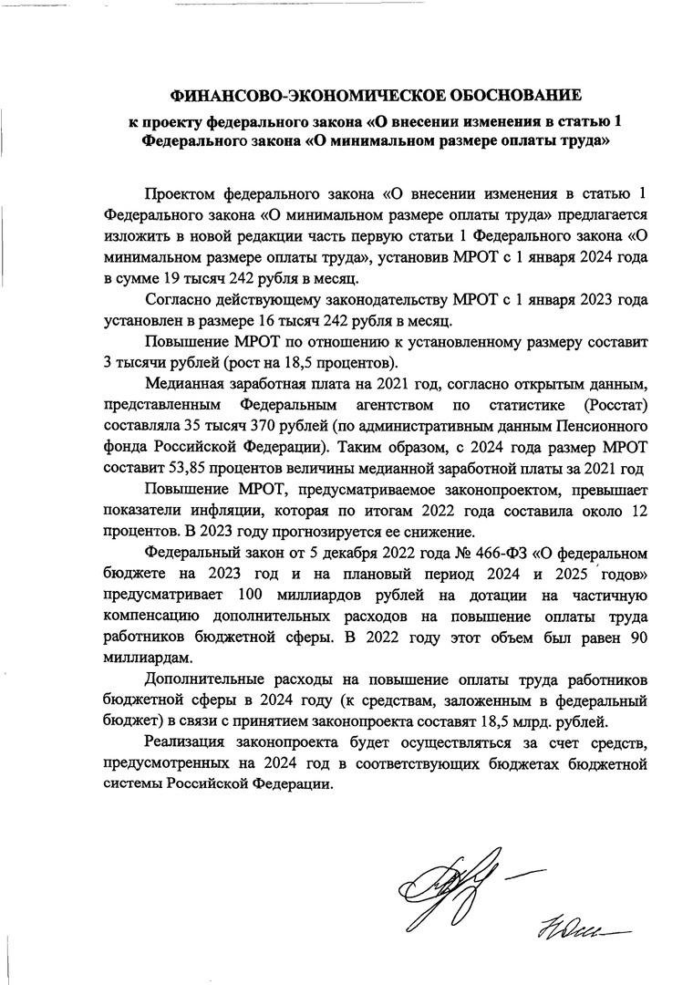 Проектом федерального закона «О внесении изменения в статью 1 Федерального закона «О минимальном размере оплаты труда» предлагается изложить в новой редакции часть первую статьи 1 Федерального закона «О минимальном размере оплаты труда», установив МРОТ с 1 января 2024 года в сумме 19 тысяч 242 рубля в месяц.