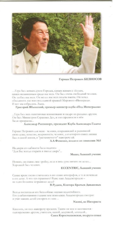 "Гера был живым духом Городка, самым тёплым, самым независимым из нас всех. Он был очень свободный человек. Он любил нас всех. Он желал всех нас видеть вместе. Он хотел объединить нас всех под единой крышей Мирового Интеграла".– И 1 октября 2007 года, на 40 дней, которые мы отмечали в Большом зале Дома учёных, зал был действительно полным.