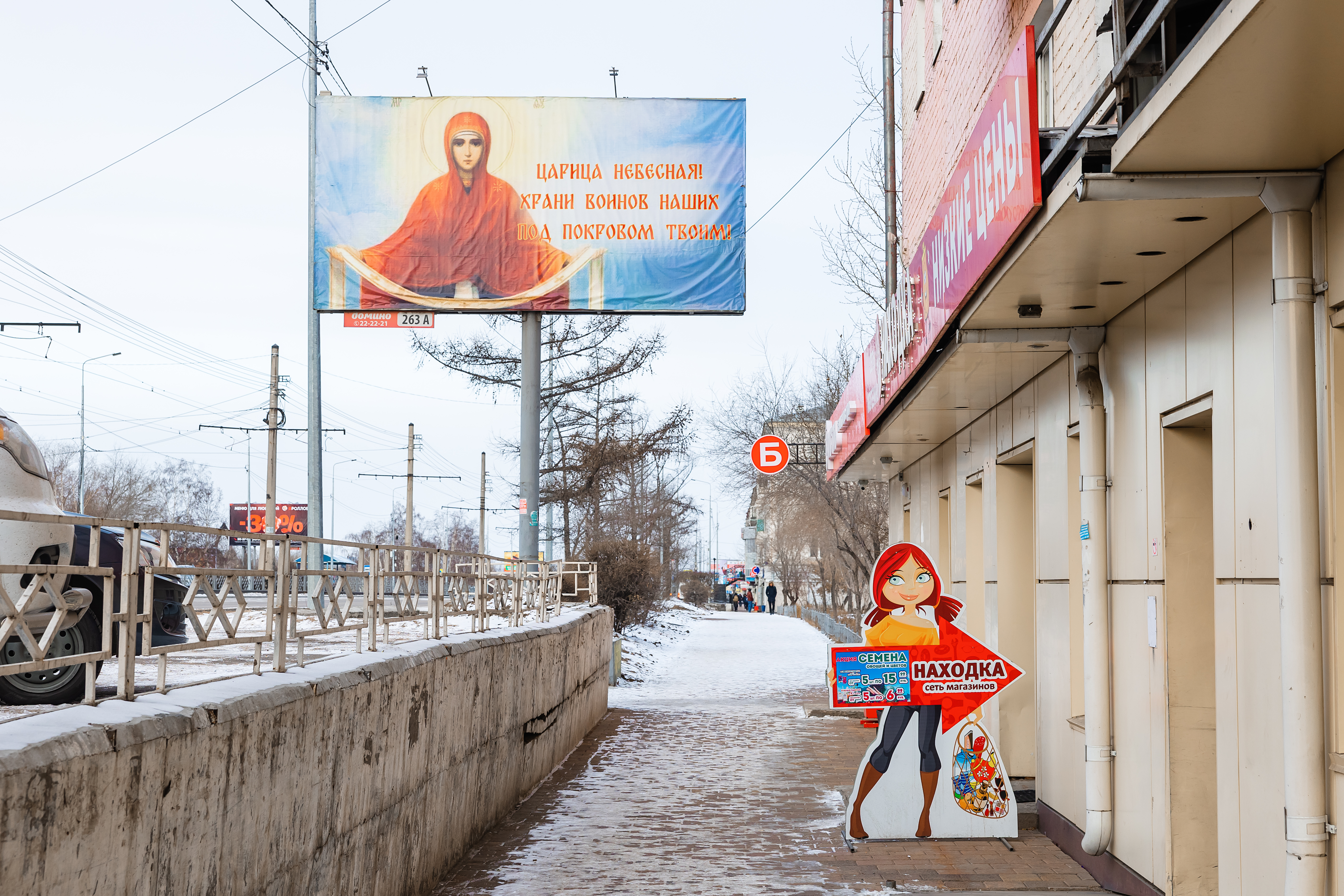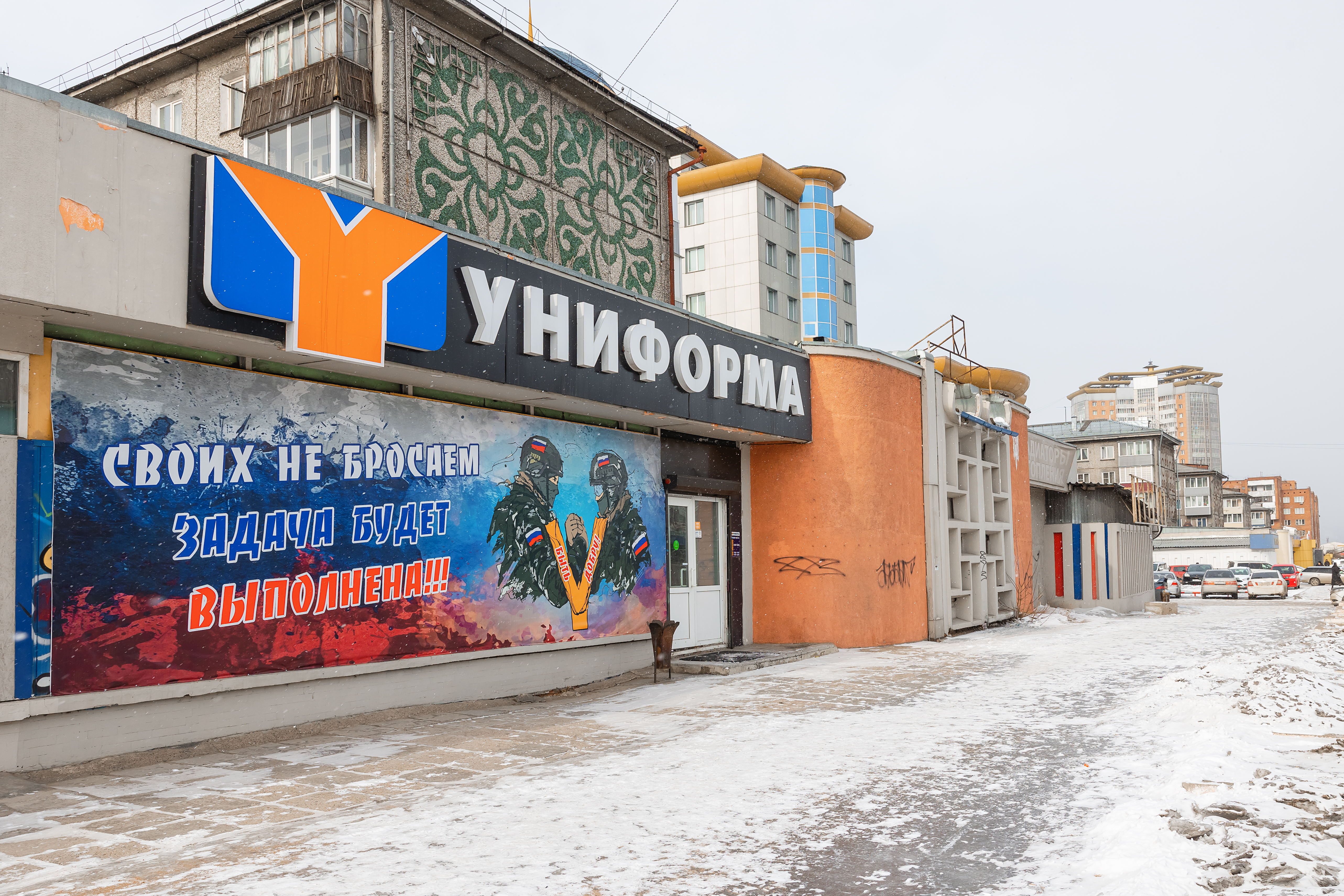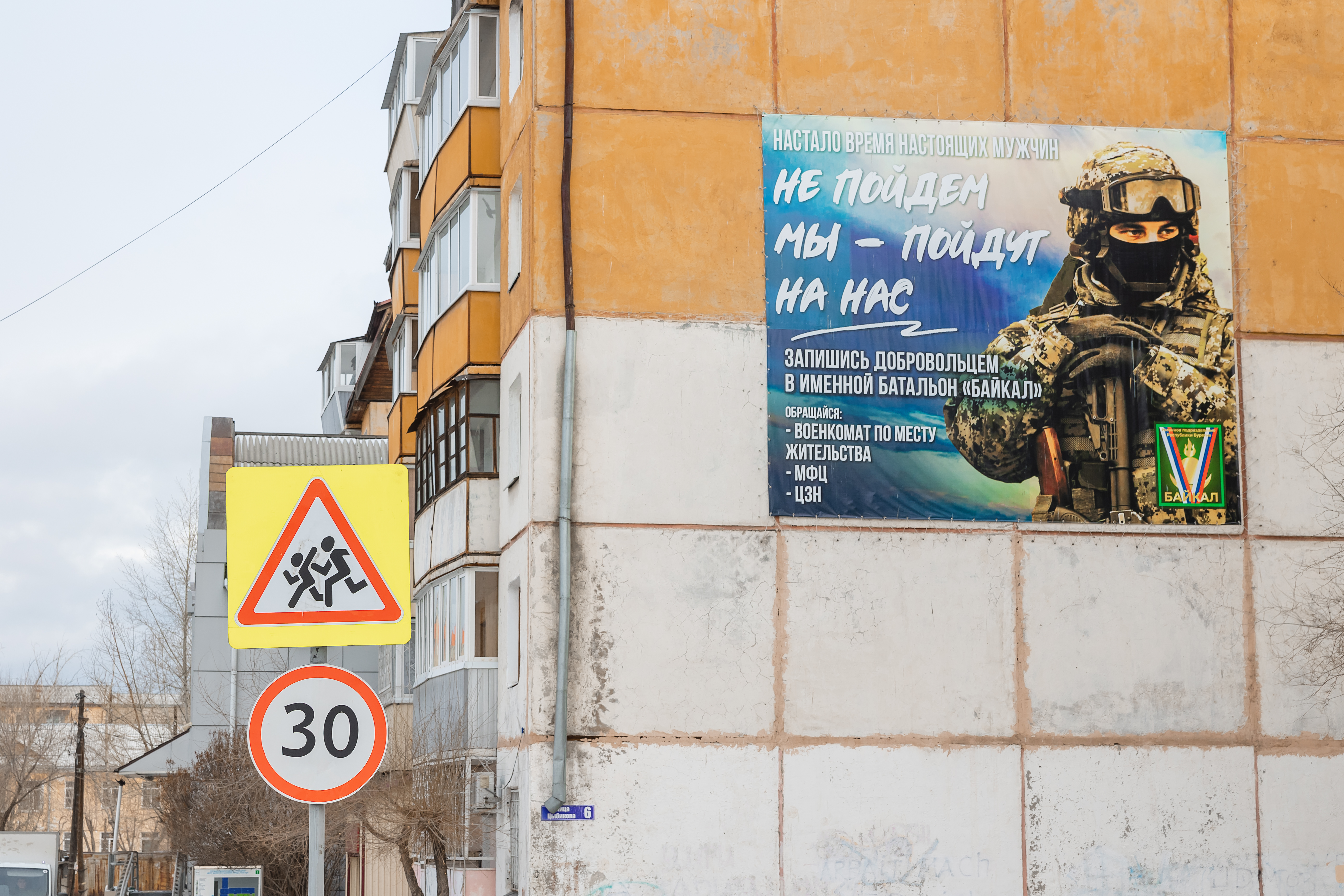 На центральном ЗАГСе второй год висит растяжка "Бурятия Za правду". На время Сагаалгана ее убрали, разместив поздравление с Белым месяцем. Есть в городе и щиты с фотографиями погибших в Украине военных, и призывы заключать контракт с Министерством обороны – потому что "есть такая работа, Родину защищать". Листовки о том, что "Стране нужны герои, защитники, истинные патриоты своего отечества", расклеиваются на подъездах многоэтажек и общественном транспорте.