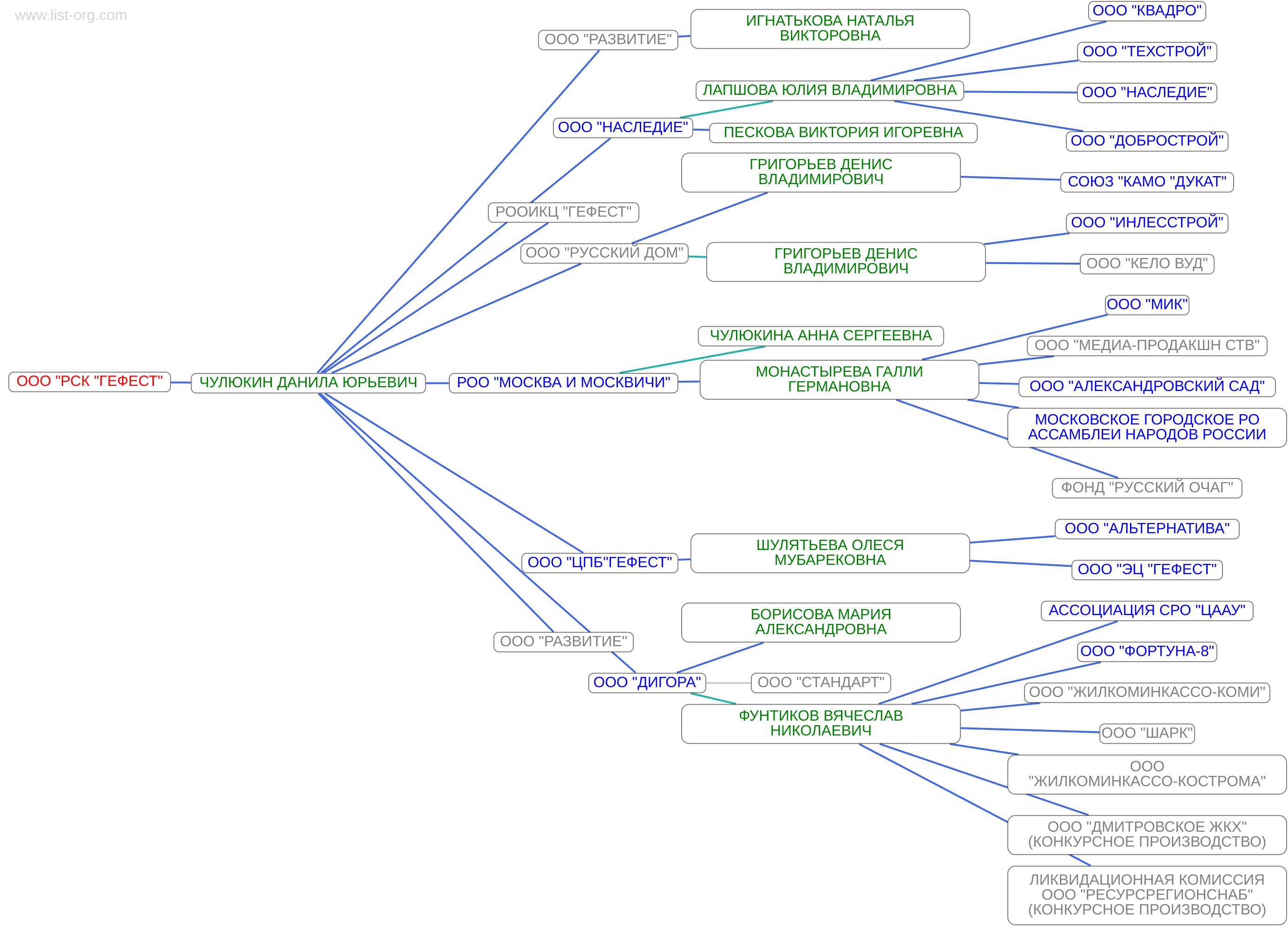 ООО «РСК «Гефест» зарегистрировано в 2005 году, генеральным директором и владельцем является Чулюкин Данила Юрьевич. Фирма успешно осваивает бюджетные контракты в качестве единственного подрядчика. По состоянию на март 2021 года таких получено на 1,9 млрд рублей, после этой даты публикации в открытых источниках прекращены из-за санкционных рисков для российских бизнесменов. Дерево связей предприятия очень разветвленное.