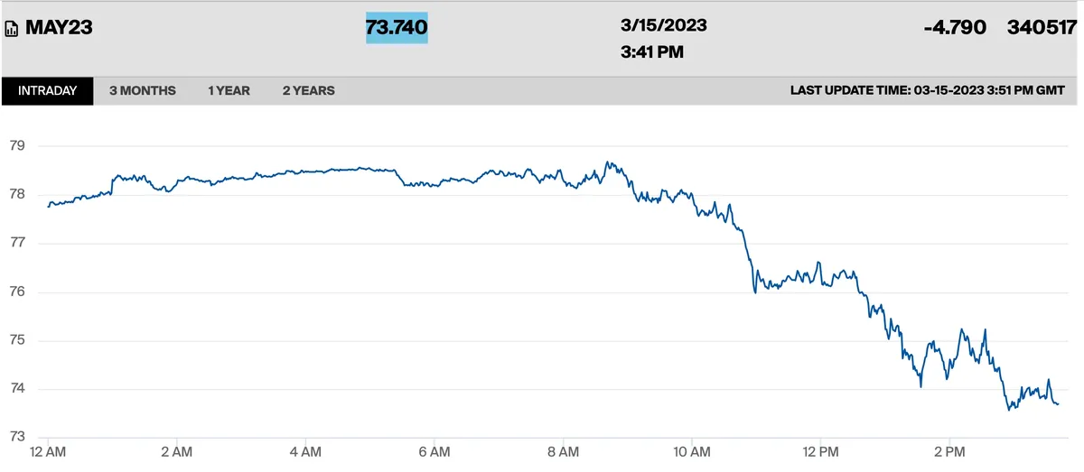 Стоимость нефти марки Brent на Лондонской межконтинентальной бирже (ICE) с поставкой в мае 2023 года опустилась ниже 74 долларов за баррель. Об этом свидетельствуют данные биржи ICE.