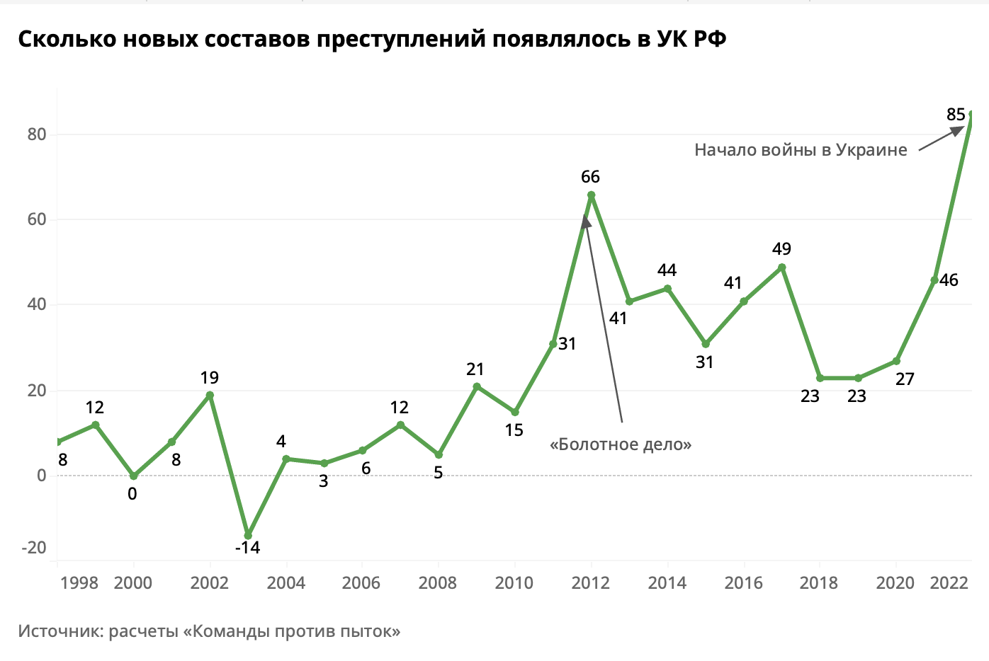 Издание «Медиазона» и правозащитный проект «Команда против пыток» назвали 2022 год «самым карательным» в истории российского Уголовного кодекса — в нем появилось рекордное количество новых статей и составов преступлений, сообщается в исследовании журналистов и правозащитников.