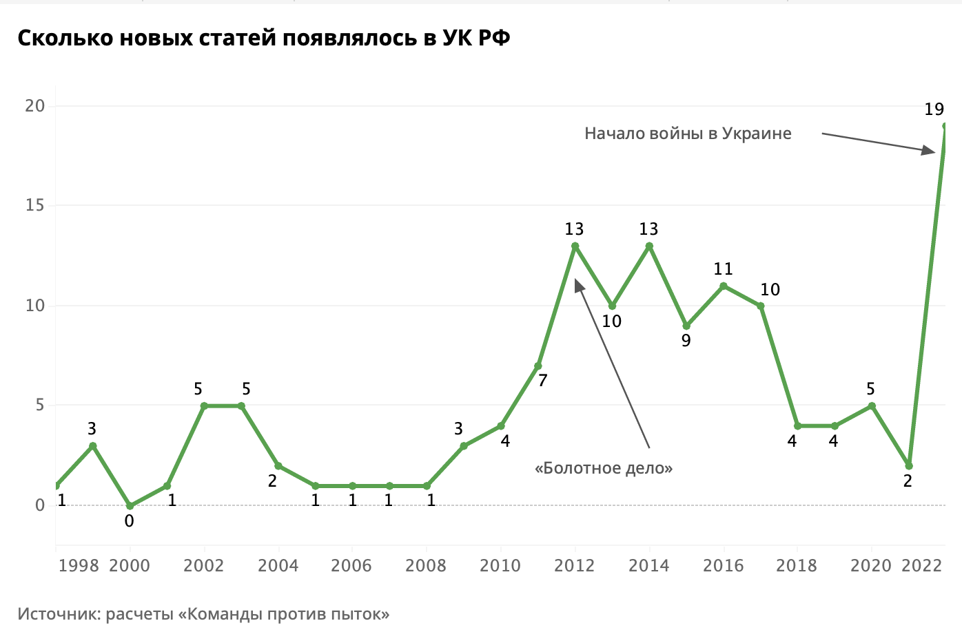 • Количество уголовных статей и составов преступлений также резко увеличивалось в 2012 году, когда в России начали рассматривать «Болотное дело», заметила «Бумага» на основе расчетов «Команды против пыток».