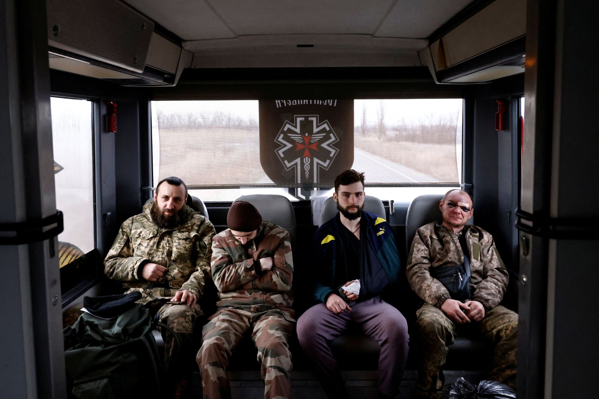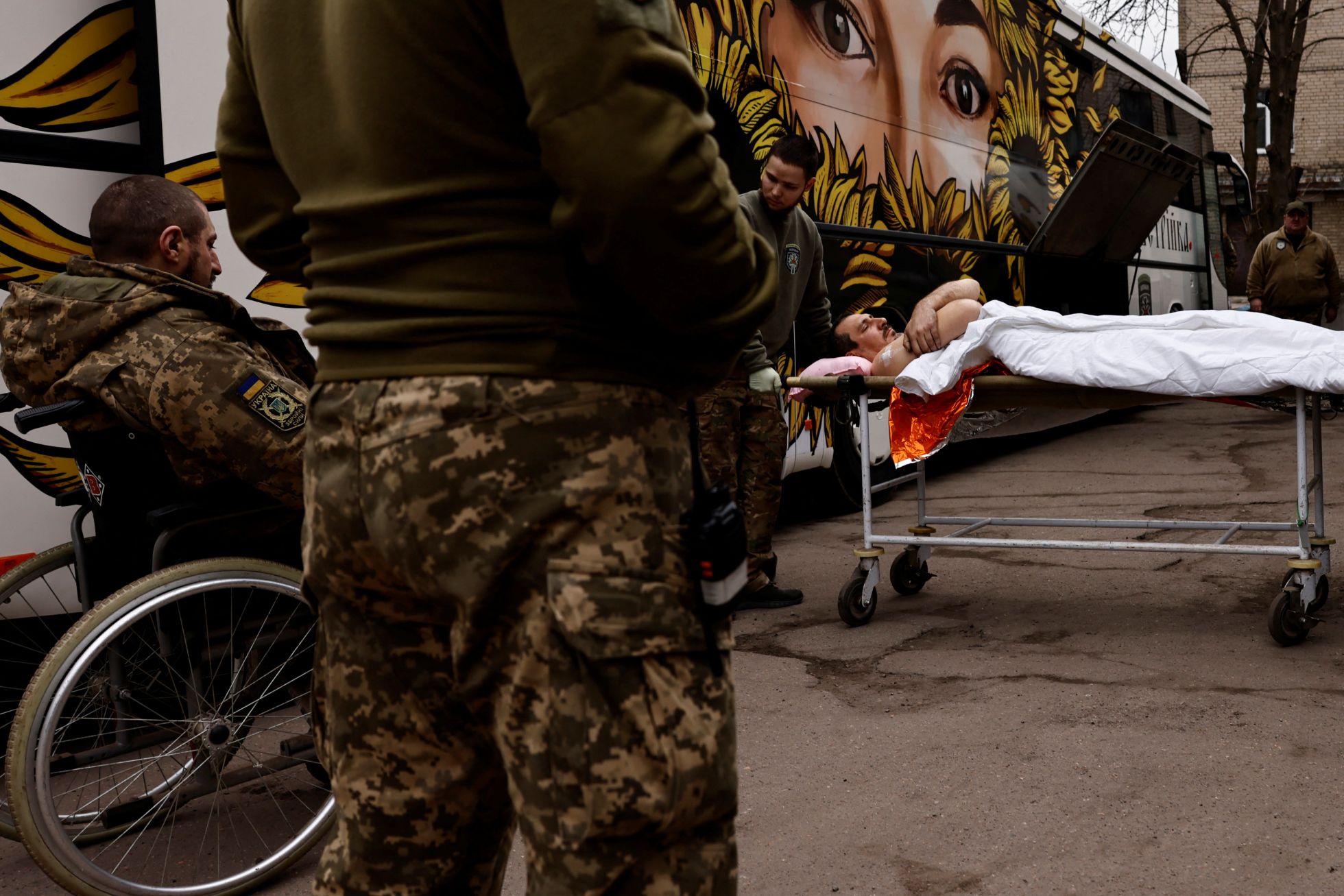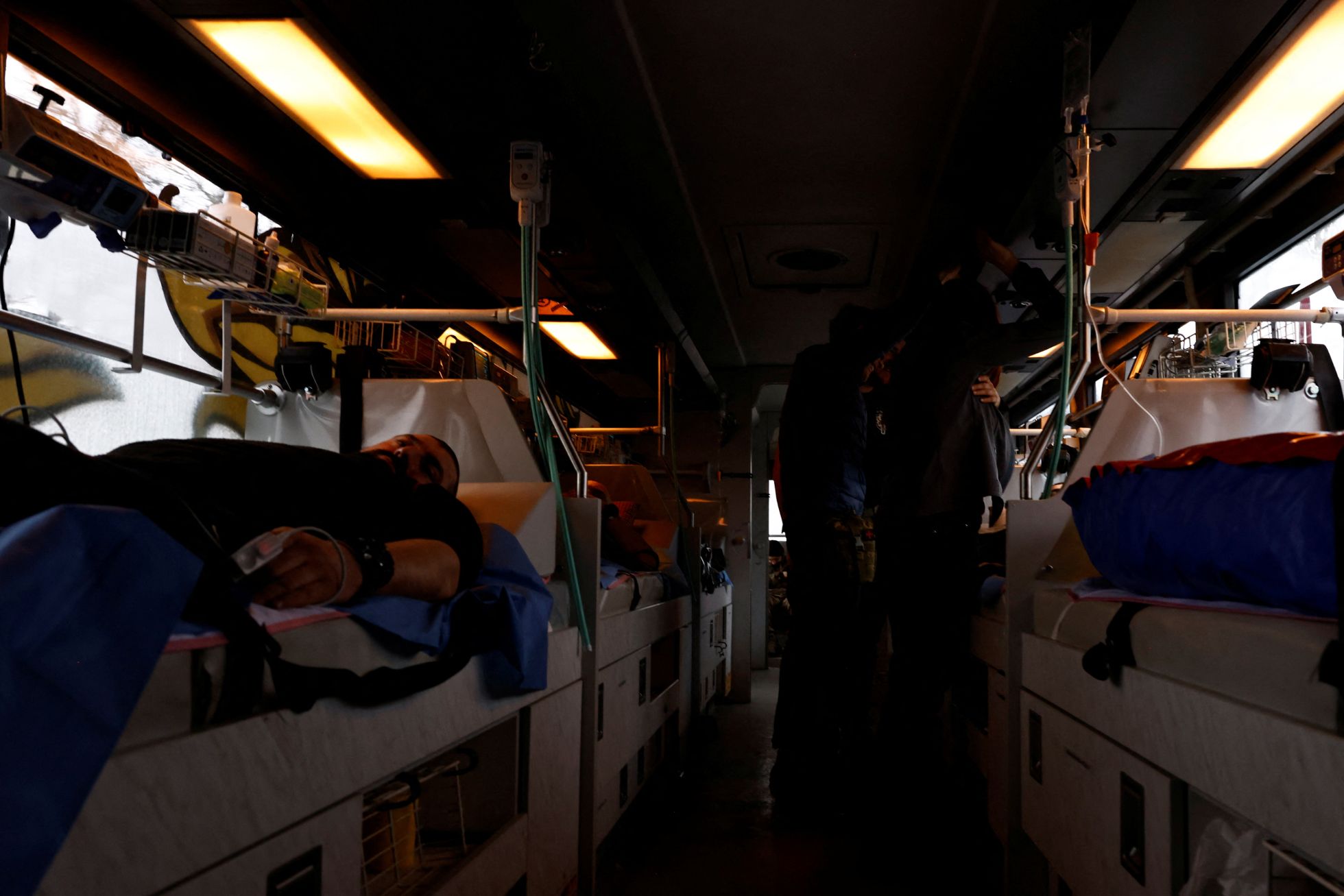 На этих фотографиях, опубликованных агентством Reuters, запечатлены раненые военнослужащие ВСУ, которых с линии фронта эвакуируют на автобусе медицинской бригады «Госпитальеры».