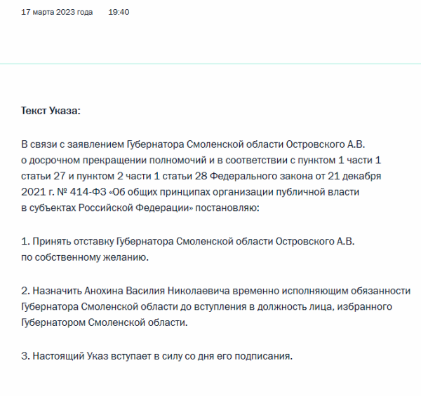 Ну что же, отставка состоялась, посмотрим, как преобразятся дороги, вырастут сады и школы, перестанут течь крыши и "благолепие сойдет на смоленскую землю".