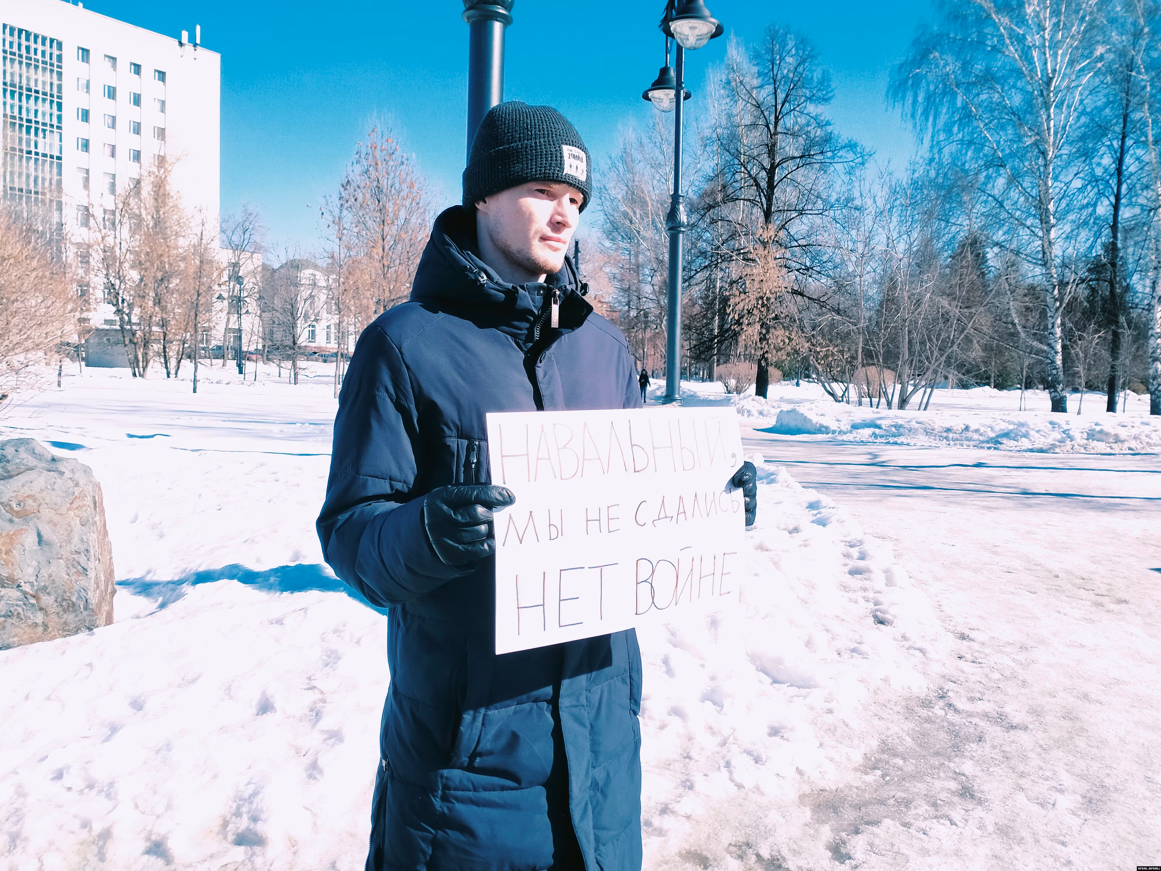 Активиста по имени Юрий задержали быстро. Он только успел развернуть плакат: "Навальный, мы не сдались. Нет войне".