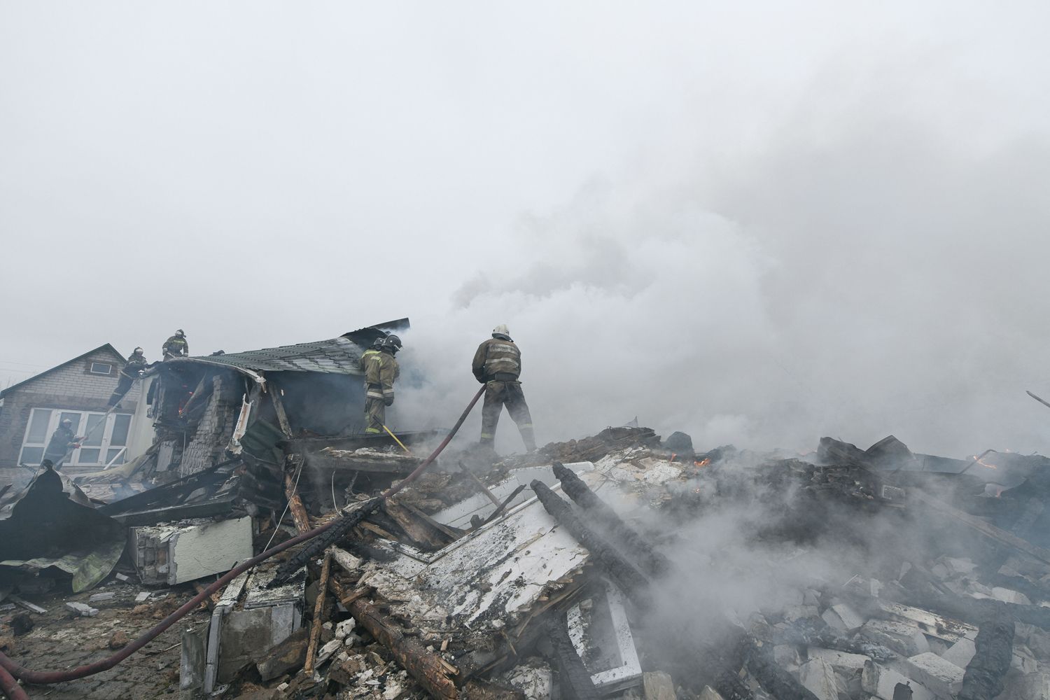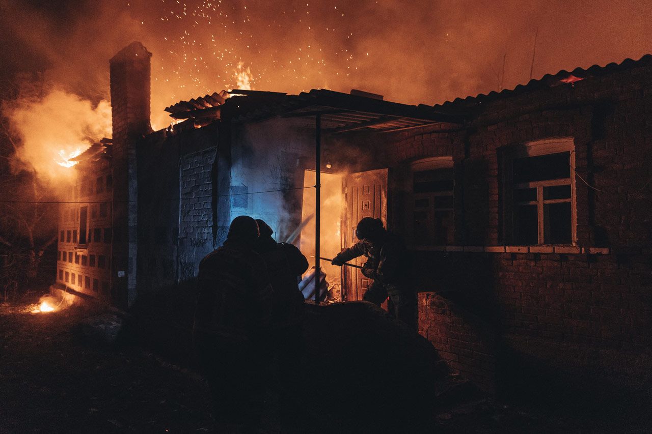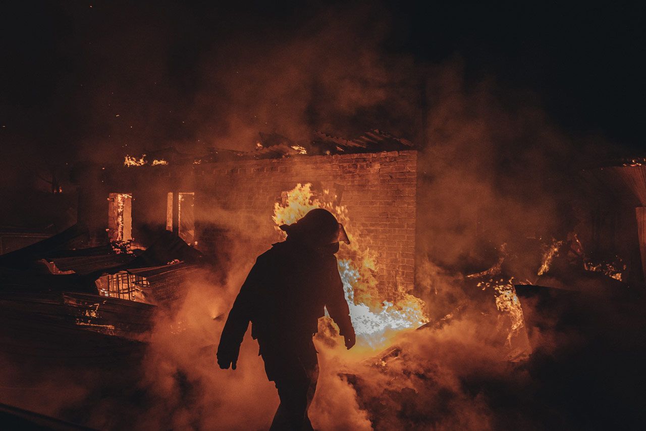 На фото: пожарные ликвидируют возгорание после обстрела города.