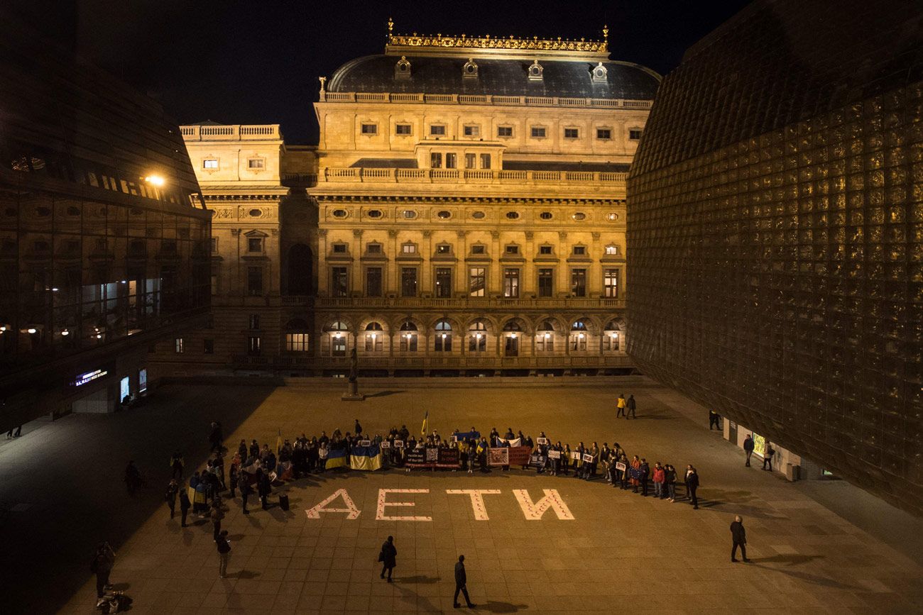 18 марта в Праге прошел митинг, приуроченный к годовщине бомбардировки драмтеатра Мариуполя. Собравшиеся на площади возле Национального театра выложили на асфальте надпись «Дети». Такая же была нарисована перед драмтеатром в Мариуполе — как предупреждение, что в здании укрываются мирные жители.