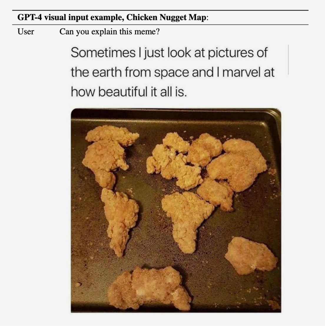 К примеру, можно попросить нейросеть объяснить смысл шутки — так и сделали разработчики OpenAI, загрузив картинку с мировой картой из наггетсов и подписью «Иногда я просто смотрю на фотографии Земли из космоса и восхищаюсь ее красотой».