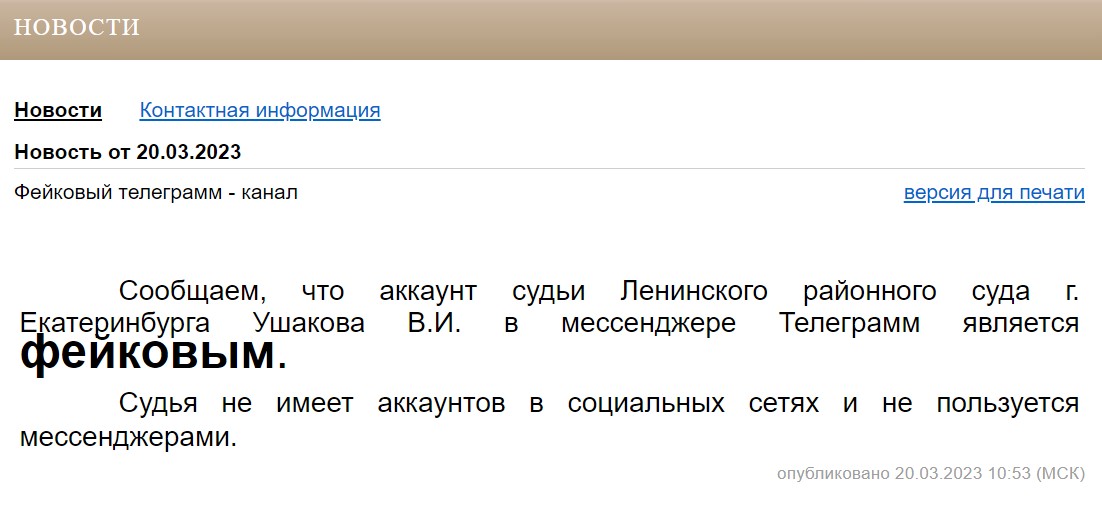 «Сообщаем, что аккаунт судьи Ленинского районного суда г. Екатеринбурга Ушакова В.И. в мессенджере Телеграмм является фейковым», — сказано в пресс-релизе.
