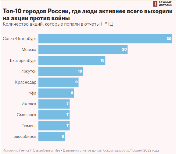 "Активнее всего против войны люди выходили в Москве и Петербурге (ровно половина всех протестов в этих городах - антивоенные выступления), в региональных центрах сибирских регионов - Екатеринбурге и Иркутске и нескольких других крупных городах. А в Улан-Удэ, Сочи, Новороссийске, удмуртском Глазове, по данным мониторинга ГРЧЦ за 116 дней, антивоенные настроения стали единственным поводом для протестов", - говорится в публикации.