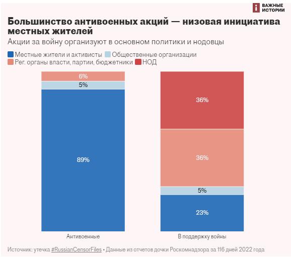 В основном выступления в поддержку "спецоперации" и действий президента организуют представители партий и околоправительственные организации. В то время как девять из десяти антивоенных акций - это низовая инициатива граждан.