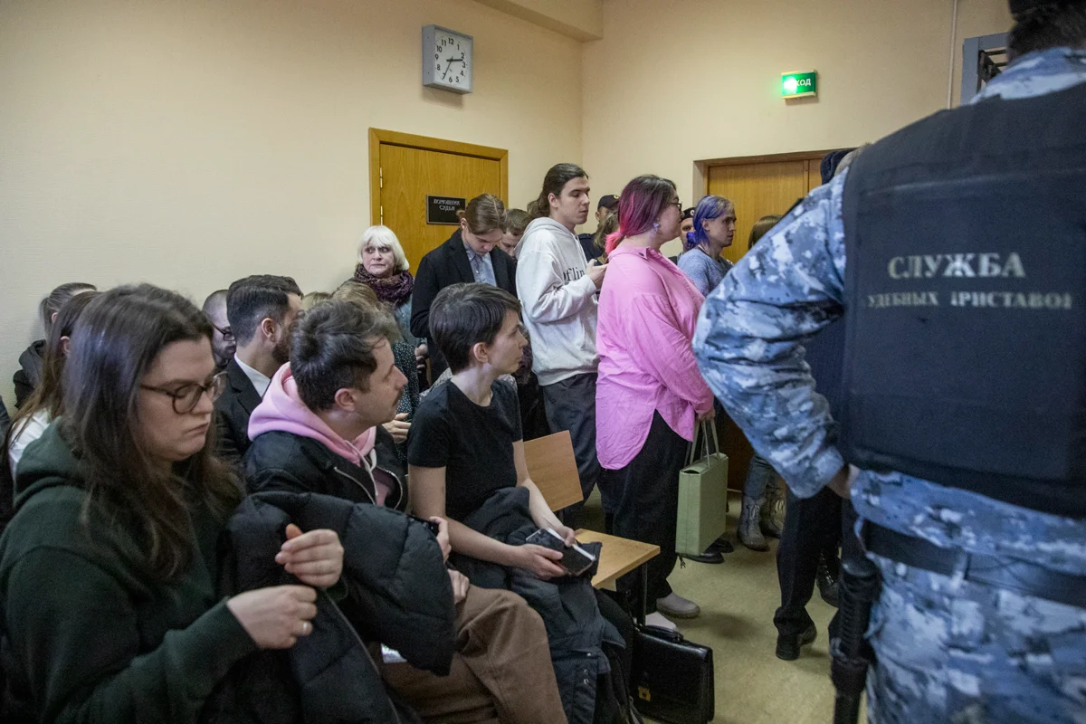 Зал № 6, где судят художницу, имеет 18 посадочных мест. Но все, кто успевает набиться в помещение до того, как приставы закроют дверь, рассаживаются и на подоконнике, и на полу. В зале душно. В основном туда пускают помощников адвокатов, представителей посольств и журналистов. Но иногда прорываются и друзья Скочиленко. На этот случай судья каждый раз устраивает проверку документов, сверяя паспорта пришедших со списком свидетелей. И если это даже однофамилец, человека удаляют из зала. В коридоре остаются десятки людей, которые пришли, по сути, ради одного — встретить Скочиленко аплодисментами и криками о свободе, когда ее заводят в зал и уводят обратно.