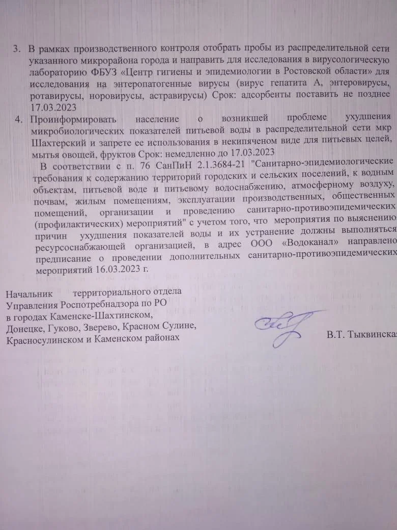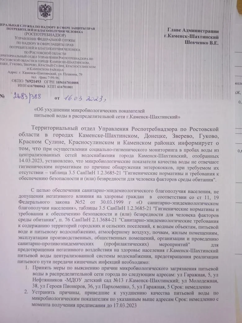 Власти города несколько дней игнорировали жалобы чешущихся каменчан, но вечером 16 марта городская администрация всё же собрала заседание комиссии по чрезвычайным ситуациям и признала, что в поселке Шахтерском (район Каменска-Шахтинского) в воде обнаружены энтерококки — бактерии, способны вызывать нарушение работы пищеварительной системы, заболевания кожи, полости рта и носа; бактериемию, бактериальный эндокардит, дивертикулит и менингит.