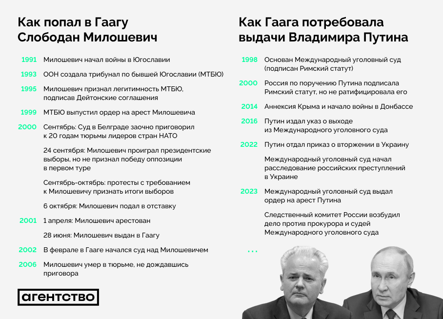 - «Мы сейчас на начальном этапе, когда Россия начала воевать с соседями. Но для повторения судьбы Милошевича также нужны разгромные военные поражения, влиятельная оппозиция, массовое протестное движение и понимание у части силового аппарата, что с этим лидером двигаться дальше уже не получится», — сказал Саморуков «Агентству». Выдача Милошевича в Гаагу, говорит эксперт, стала возможной, в том числе благодаря негласной договорённости между силовиками и оппозицией: «И те, и другие считали, что Милошевич давно себя исчерпал и всем только мешает».